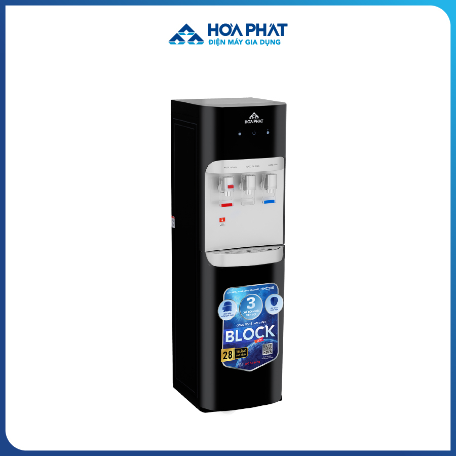 - Bảo hành vượt trội lên tới 28 tháng. CÂY NƯỚC NÓNG LẠNH HÚT BÌNH HHC385 Là cây nước nóng lạnh Hòa Phát thế hệ mới với 3 chế độ nước - 3 vòi Nóng, Lạnh, Thường, sản phẩm sử dụng công nghệ BLOCK làm lạnh nước nhanh và sâu tới 5 độ C, công suất làm nóng cao vượt trội cho nước nóng tới 95 độ chỉ sau 2 phút. Được thiết kế với ngoại quan tinh tế, sang trọng, vỏ nhựa ABS sơn tĩnh điện trơn láng, cây nước nóng lạnh hút bình Hòa Phát sẽ làm đẹp thêm không gian gia đình bạn. NƯỚC LẠNH SÂU TỚI 5 ĐỘ C VỚI CÔNG NGHỆ BLOCK ƯU VIỆT Hệ thống lạnh dùng công nghệ Block hiệu suất cao BLOCK R134a giúp máy làm lạnh nước vượt trội, nước lạnh nhanh hơn chỉ trong 30 phút và lạnh sâu tới 5 độ C, đồng thời tiết kiệm điện năng và vận hành bền bỉ hơn. Cùng dung tích bình lạnh lên tới 3,3 lít, cây nước nóng lạnh Hòa Phát đảm bảo khả năng cung cấp nước lạnh liên tục đáp ứng mọi nhu cầu, phù hợp với mọi không gian như gia đình, văn phòng, trường học, công xưởng, bệnh viện, nơi công cộng,... LÀM NƯỚC NÓNG NHANH CHỈ SAU 2 PHÚT VỚI CÔNG SUẤT CỰC KHỎE Cây nước nóng lạnh Hòa Phát thế hệ mới đều có mức công suất bình nóng 580W giúp làm nước nóng nhanh tức thì, thời gian làm nóng dưới 2 phút. Sau mỗi lần tắt công tắc làm nóng, lớp bảo ôn giữ nhiệt lên tới 2,5 giờ mới cần đun lại. Với mức công suất như vậy, cây nước sẽ luôn cung cấp nước nóng nhanh chóng mà vẫn đảm bảo tiết kiệm điện. 03 CHẾ ĐỘ NƯỚC TIỆN LỢI, PHÙ HỢP MỌI NHU CẦU Cây nước nóng lạnh Hòa Phát có tối đa lên tới 3 chế độ nước “Nóng - Nguội - Lạnh” với 3 vòi riêng biệt, đa công năng phù hợp với nhiều nhu cầu sử dụng như nước nóng pha trà hay cà phê, pha mì tôm, nước lạnh giải khát, nước nguội uống ngay,... Đây là phiên bản mới và hiện đại nhất trên thị trường hiện nay. TÍCH HỢP TÍNH NĂNG AN TOÀN Cây nước nóng lạnh của ĐMGD Hòa Phát được trang bị đầy đủ tính năng an toàn như: Cảnh báo hết nước, bảo vệ quá nhiệt kép, khóa trẻ em đối với vòi nước nóng, an toàn tuyệt đối trong quá trình sử dụng. BẢO HÀNH LÂU NHẤT THỊ TRƯỜNG TỚI 28 THÁNG Với định vị "Bền - Chuẩn Hòa Phát", các cây nước nóng lạnh trong BST Thế hệ mới đều có thời gian bảo hành vượt trội lên tới 28 tháng, khách hàng an tâm, thoải mái sử dụng lâu dài. THIẾT KẾ HIỆN ĐẠI, TINH TẾ Sở hữu thiết kế tối giản, hiện đại với màu đen nguyên khối, nhỏ gọn dễ dàng xếp vừa mọi vị trí, cây nước nóng lạnh hút bình Hòa Phát sẽ giúp không gian gia đình thêm phần tinh tế. Bên cạnh đó khung tủ làm từ nhựa ABS nguyên sinh giúp bề mặt nhẵn bóng, sắc nét, tăng độ cứng cáp cho sản phẩm.