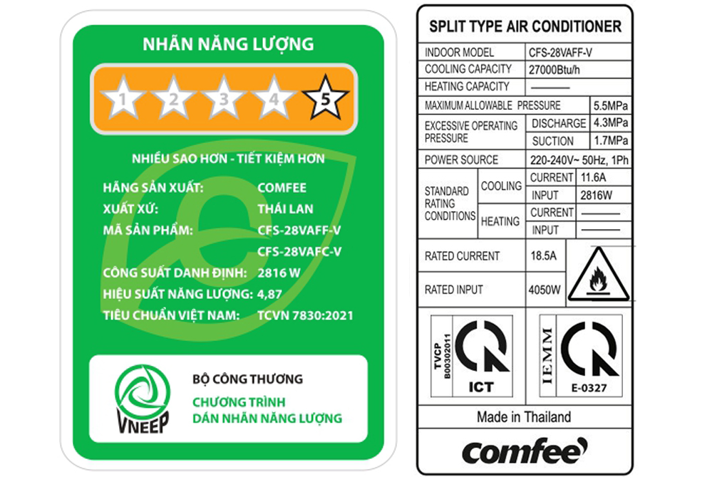 - Làm nổi bật không gian nội thất của bất kì căn phòng nào như phòng khách, phòng ăn, phòng ngủ với lớp vỏ nhựa màu trắng đẹp mắt và sang trọng, máy lạnh Comfee là một lựa chọn hợp lý cho phong cách sống hiện đại. Bạn có thể dễ dàng theo dõi mức nhiệt độ hiện có trên máy lạnh bằng màn hình LCD trên vỏ máy. Dàn nóng - Ống gas bằng đồng, lá tản nhiệt bằng nhôm phủ lớp chống ăn mòn Golden Coating là hai yếu tố quan trọng của dàn tản nhiệt, giúp cho máy có thể hoạt động dài lâu mà vẫn đảm bảo hiệu suất ổn định và độ bền cao. *Hình ảnh chỉ mang tính chất minh họa Công nghệ làm lạnh - Máy lạnh sẽ hoạt động ở mức công suất 3 HP - 27.000 BTU trong không gian có diện tích từ 40 - 50m².