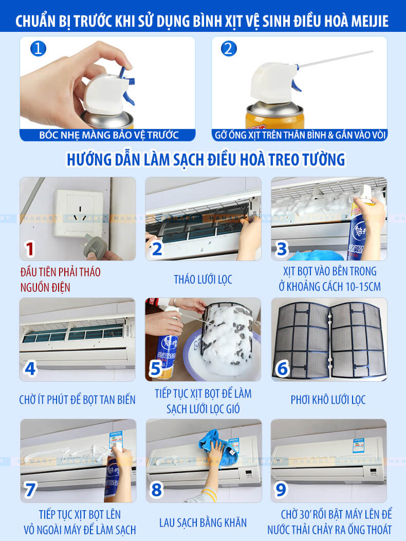 - Đóng Gói: Bình xịt + Vòi phun HƯỚNG DẪN SỬ DỤNG: *** Đầu tiên bạn cần NGẮT ĐIỆN / ĐÓNG CẦU DAO của máy - Mở nắp bảo vệ, bẻ tấm nhựa khoá nắp phun trên đầu & lắp ống phun nhỏ đi kèm trước khi sử dụng - dùng 1 bao nylon lớn bao toàn bộ thân máy (tránh chất lỏng rơi vãi) I - HD vệ sinh điều hoà treo tường: