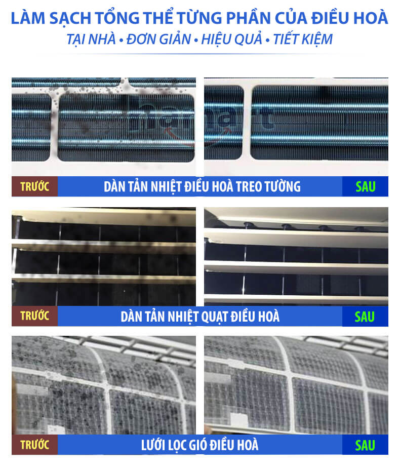 - Làm sạch đa năng dàn lạnh, quạt điều hoà, điều hoà ô tô...