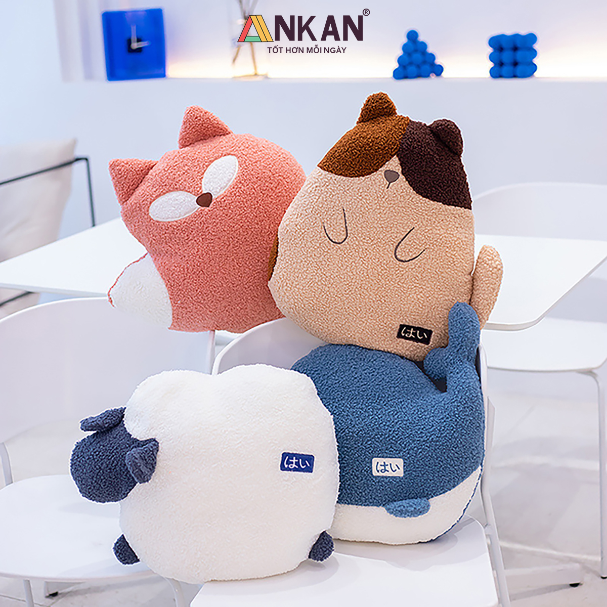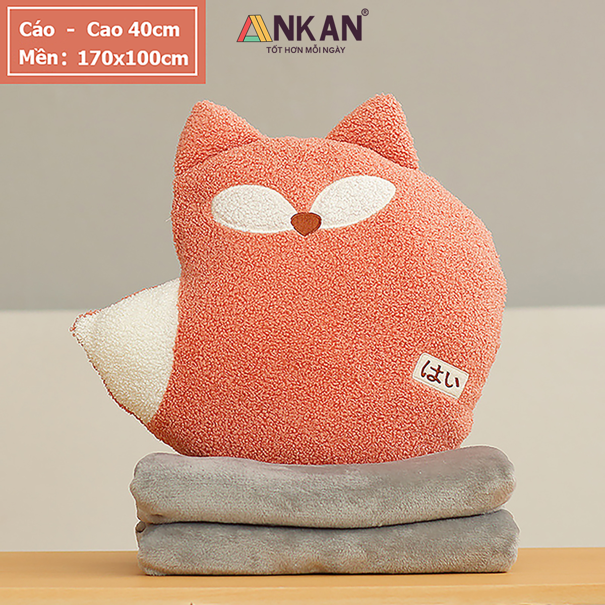 Bộ Chăn Gối Văn Phòng Đa Năng Hình Thú Gấu Bông Dễ Thương, Tiện Lợi Cho Bé Đi Học Và Du Lịch CHĂN GỐI VĂN PHÒNG ANKAN CÓ GÌ ĐẶC BIỆT Thiết kế hình thú xinh xắn, phù hợp làm quà sinh nhật, quà tặng bạn bè, người yêu, đồng nghiệp. Đa năng 3 trong 1: vừa là gối ôm – gối tựa lưng – gối luồn tay, kèm chăn êm giữ ấm. Sử dụng tiện lợi cho nhiều mục đích: ngủ trưa văn phòng, đi học, đi làm, du lịch. Trên sản phẩm có nhãn chữ “はい” (hai) – nghĩa là “Vâng” trong tiếng Việt, mang đến cảm giác dễ thương, tích cực và gần gũi theo phong cách Nhật Bản. CAM KẾT TỪ ANKAN Sản phẩm đúng mô tả, đúng mẫu, đúng kích thước. Đổi trả trong 15 ngày nếu khách không hài lòng. Hoàn tiền 100% nếu sản phẩm lỗi do nhà sản xuất. Đóng gói sạch sẽ, an toàn, giao hàng nhanh chóng. THÔNG SỐ KỸ THUẬT Kích thước gối: 40 x 35 cm. Kích thước chăn: 100 x 170 cm (được lồng gọn trong gối). Chất liệu vỏ: vải nhung siêu mềm. Chất liệu ruột: bông PP cao cấp, an toàn cho da. Trọng lượng: khoảng 800g. Có 4 kiểu dáng để bạn lựa chọn là Cáo Đỏ, Cá Voi Xanh, Cừu Trắng và Gấu Nhật Bản ƯU ĐIỂM NỔI BẬT Vải nhung mềm mịn, thoáng khí, dễ giặt sạch.