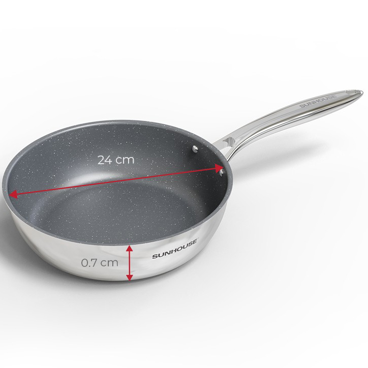 Đáy inox 430 còn giúp bạn sử dụng chảo Sunhouse Mama DEM hiệu quả trên mọi loại bếp như bếp từ, bếp hồng ngoại, bếp gas… Cấu tạo đáy liền thân giúp chống cong vênh hay phồng đáy, chống bong đáy.