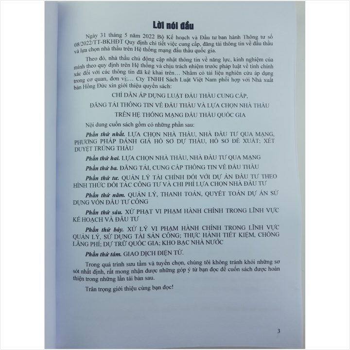 - Toàn bộ sách bìa mềm khổ lớn 19 x 27 cm phân phối bởi Nhà sách Nam Việt đều được bọc sách Plastic MIỄN PHÍ và xuất hóa đơn điện tử đầy đủ, nhanh chóng. .... Từ ngày 1 tháng 8 năm 2022, việc cung cấp, đăng tải thông tin về đấu thầu và lựa chọn nhà thầu trên Hệ thống mạng đấu thầu quốc gia được thực hiện theo quy định tại Thông tư số 08/2022/TT-BKHĐT do Bộ Kế hoạch và Đầu tư mới ban hành. Theo đó, thông tin về năng lực, kinh nghiệm của nhà thầu trên Hệ thống mạng đấu thầu quốc gia (Hệ thống), bao gồm: Thông tin chung về nhà thầu; số liệu về báo cáo tài chính hằng năm; thông tin về các hợp đồng đã và đang thực hiện; thông tin về nhân sự chủ chốt; thông tin về máy móc, thiết bị; thông tin về uy tín của nhà thầu. .../... Nội dung cuốn sách gồm có những phần sau: Phần thứ nhất. Lựa chọn nhà thầu, nhà đầu tư qua mạng, phương pháp đánh giá hồ sơ dự thầu, hồ sơ đề xuất; xét duyệt trúng thầu Phần thứ hai. Lựa chọn nhà thầu, nhà đầu tư qua mạng Phần thứ ba. Đăng tải, cung cấp thông tin về đấu thầu Phần thứ tư. Quản lý tài chính đối với dự án đầu tư theo hình thức đối tác công tư và chi phí lựa chọn nhà đầu tư Phần thứ năm. Quản lý, thanh toán, quyết toán dự án sử dụng vốn đầu tư công Phần thứ sáu. Xử phạt vi phạm hành chính trong lĩnh vực kế hoạch và đầu tư Phần thứ bảy. Xử lý vi phạm hành chính trong lĩnh vực quản lý, sử dụng tài sản công; thực hành tiết kiệm, chống lãng phí; dự trữ quốc gia; kho bạc nhà nước Phần thứ tám. Giao dịch điện tử. ... Cảm ơn các bạn đã ghé thăm shop Nhà sách Nam Việt trên TIKI Sách Chỉ Dẫn Áp Dụng Luật Đấu Thầu - Cung Cấp, Đăng Tải Thông Tin Về Đấu Thầu Và Lựa Chọn Nhà Thầu Trên Hệ Thống Mạng Đấu Thầu Quốc Gia Sách Chỉ Dẫn Áp Dụng Luật Đấu Thầu - Cung Cấp, Đăng Tải Thông Tin Về Đấu Thầu Và Lựa Chọn Nhà Thầu Trên Hệ Thống Mạng Đấu Thầu Quốc Gia