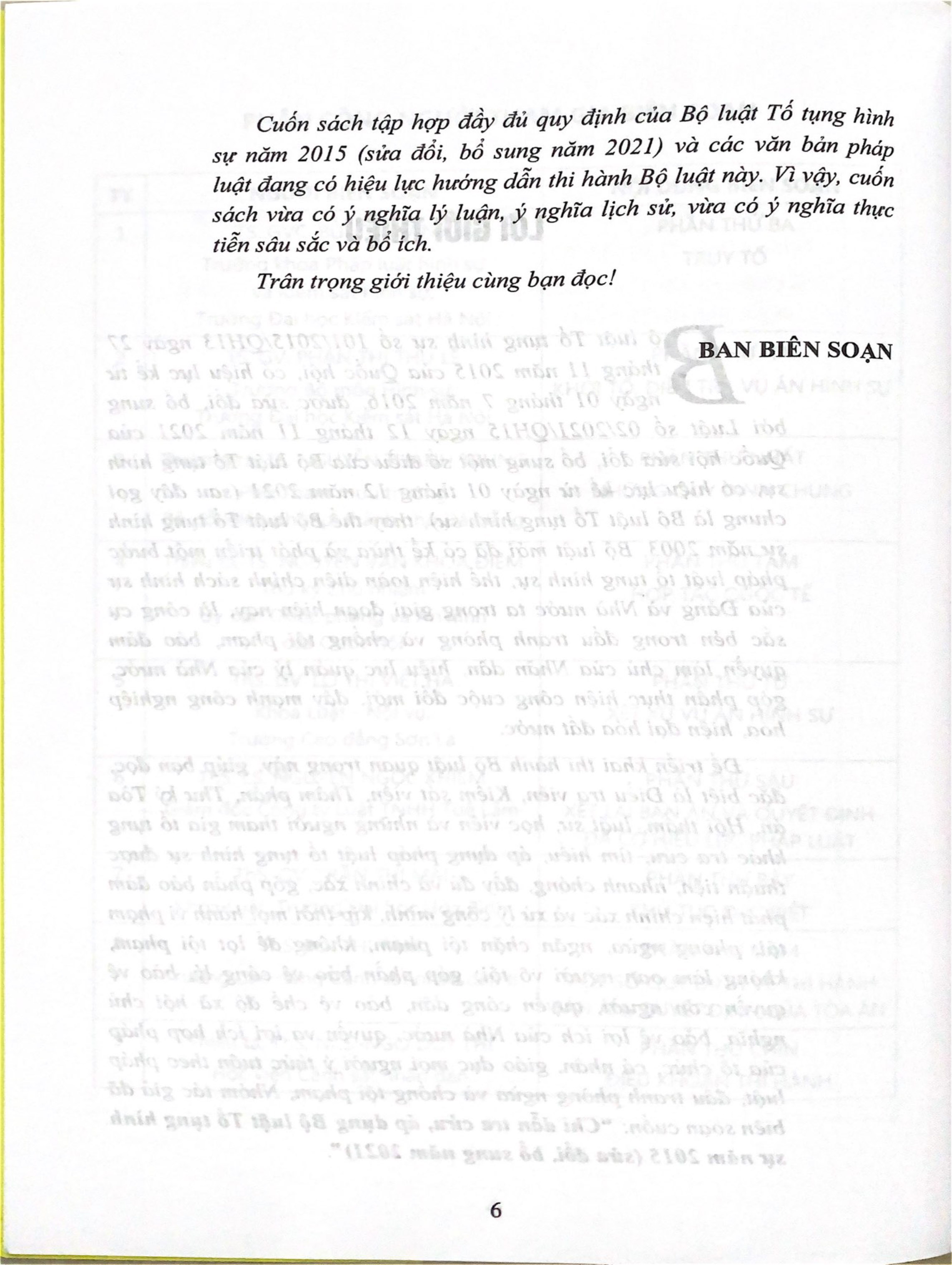 Cuốn sách tập hợp đầy đủ quy định của Bộ luật Tố tụng hình sự năm 2015 (sửa đổi, bổ sung năm 2021) và các văn bản pháp luật đang có hiệu lực hướng dẫn thi hành Bộ luật này. Vì vậy, cuốn sách vừa có ý nghĩa lý luận, ý nghĩa lịch sử, vừa có ý nghĩa thực tiễn sâu sắc và bổ ích.