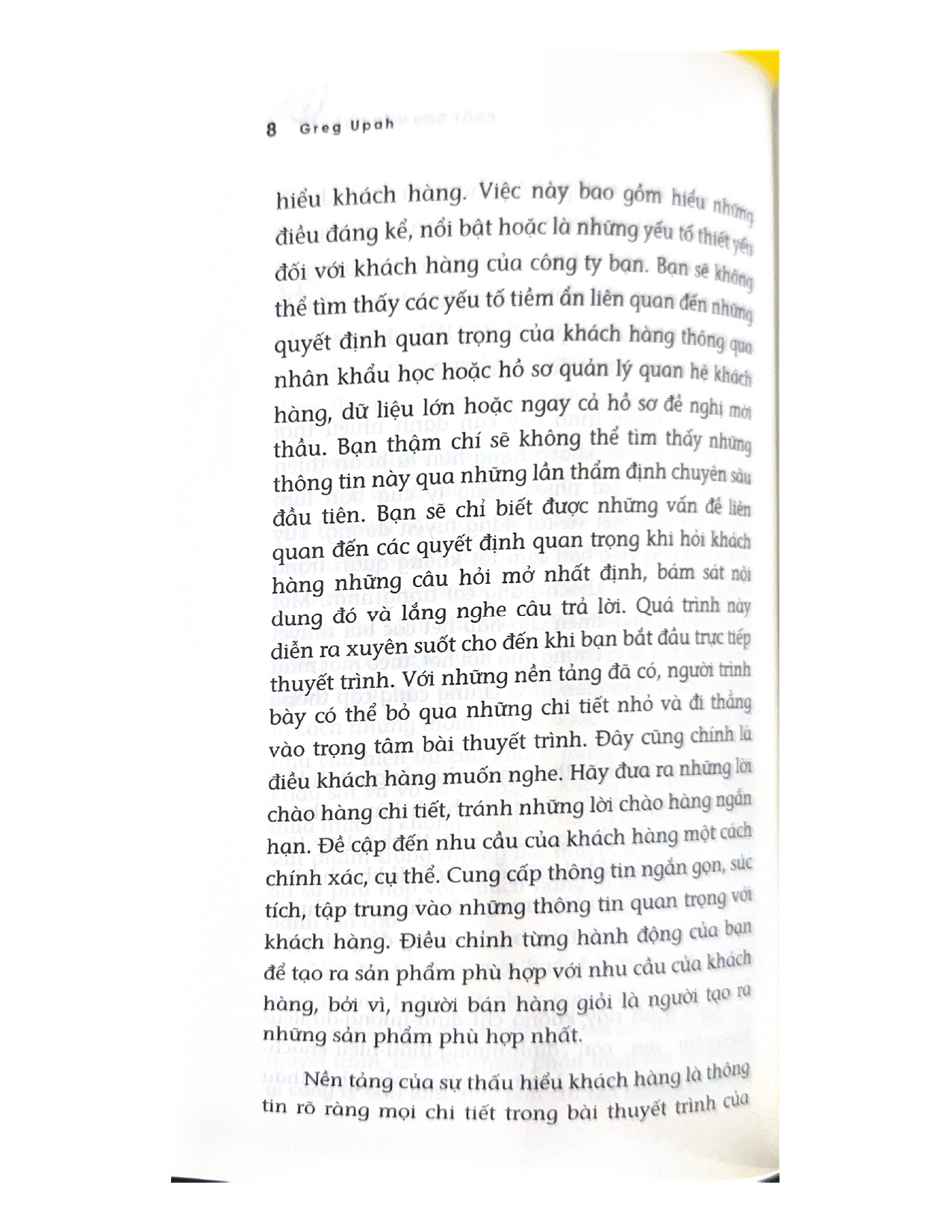 - Giới thiệu Chốt Đơn Hiệu Quả Lý do người nghe mua những gì người thuyết trình giới thiệu, vì họ tin những thứ đó sẽ giúp giải quyết vấn đề hiện tại của mình theo cách tốt nhất. Do đó, người thuyết trình cần ưu tiên sự chính xác, và thấu hiểu những khía cạnh quan trọng trong mục tiêu của khách hàng. Sự thấu hiểu đó sẽ giúp người thuyết trình tự tin và liên tục thay đổi chiến thuật trước những thông tin mới, cho đến khi phù hợp với nhu cầu của khách hàng. Khi thuyết trình chào hàng, nếu bạn chỉ cung cấp thông tin thôi thì sẽ không đủ. Để hoàn toàn thuyết phục người khác, bạn cần thấu hiểu mục tiêu và động lực của họ. Bạn cũng cần có những kỹ năng mềm và phương pháp giúp bạn có những phản ứng “sáng suốt” cần thiết để tự tin vượt qua thử thách và thích ứng với những tình huống mới. Khi đưa ra lời chào hàng, hãy chú trọng vào “cách thức”, bớt tập trung vào phần “cái gì” hoặc là “tại sao”. Người thuyết trình sẽ trở nên thuyết phục hơn nếu làm theo từng nguyên tắc trong sách hoặc kết hợp chúng, để chốt đơn dễ dàng hơn.