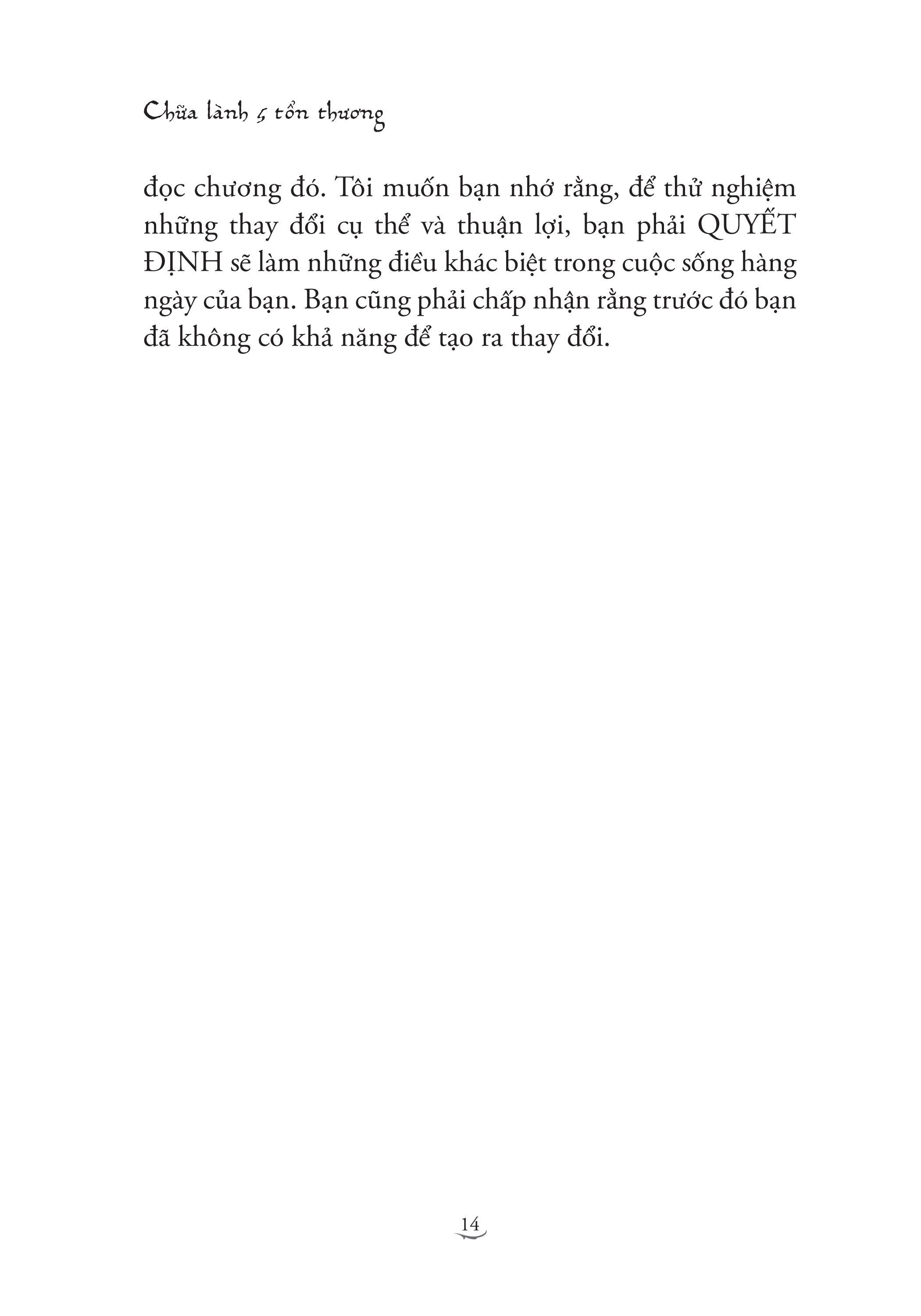 Trong cuốn sách này, bạn sẽ học được cách nhận ra cơ chế của những tổn thương và biết được khi nào thì chúng bị kích hoạt. Để chữa lành được tổn thương thì chúng ta nhất định phải nhận ra vô vàn các trường hợp mà cái tôi (mặt nạ nguỵ trang của chúng ta) dẫn dắt suy nghĩ, lời nói và hành động của chúng ta.