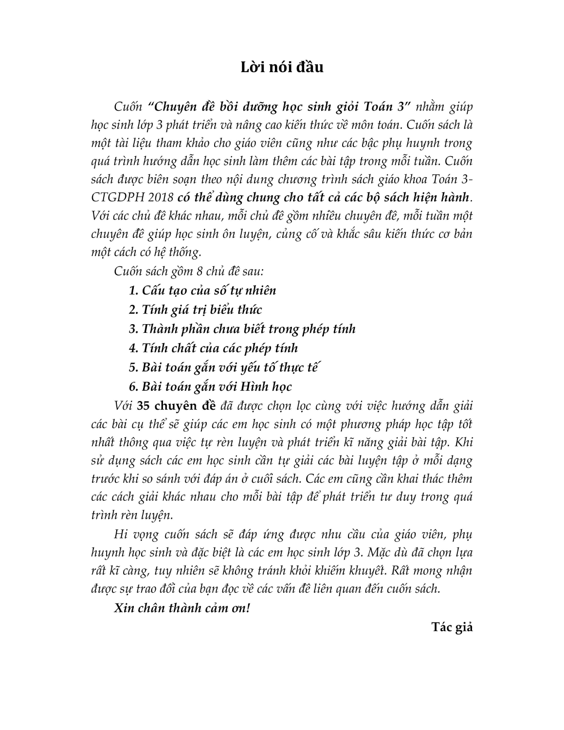 Cuốn Chuyên Đề Bồi Dưỡng Học Sinh Giỏi Toán 3 nhằm giúp học sinh lớp 3 phát triển và nâng cao kiến thức môn toán. Cuốn sách là Cuốn “Chuyên đề bồi dưỡng học sinh giỏi Toán 3” một tài liệu tham khảo cho giáo viên cũng như các bậc phụ huynh trong quá trình hướng dẫn học sinh làm thêm các bài tập trong mỗi tuần. Cuốn sách được biên soạn theo nội dung chương trình sách giáo khoa Toán 3 - CTGDPH 2018 có thể dùng chung cho tất cả các bộ sách hiện hành. Với các chủ đề khác nhau, mỗi năm gồm nhiều chuyên đề, mỗi tuần một chuyên đề giúp học sinh ôn luyện, củng cố và khắc sâu kiến thức cơ bản.