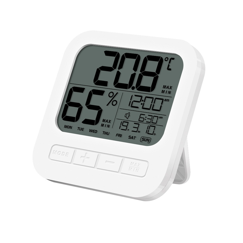 Mua tại TiktokHOM-HCM2201-TOOL10007-01 Nhiệt kế, Nhiệt kế điện tử, Nhiệt kế phòng, Nhiệt ẩm kế, đo nhiệt độ và độ ẩm trong phòng Thông tin chung: Nhiệt độ và độ ẩm là 2 yếu tố ảnh hưởng rất lớn để giấc ngủ của bé. Nhiệt độ trên điều hòa sẽ không phản ánh được chính xác nhiệt độ trong phòng vì còn phụ thuộc vào nhiều yếu tố: nhiêt độ bên ngoài, diện tích phòng, vị trí bé nằm. Vì vậy cần có nhiệt kế để biết chính xác nhiệt độ trong phòng của bé. Nhiệt độ lý tưởng cho bé ngủ ngon là 16 - 24 độ, độ ẩm là 40 - 60%. Chức năng: Đo nhiệt độ Đo độ ẩm Đồng hồ Xem ngày , tháng, năm Chức năng hẹn giờ Thông số máy: Mắc sắc: Trắng Kích thước: 10 x 10 x 2 cm. Chất liệu: Nhựa ABS. Phạm vi nhiệt độ: -10 độ C đến 50 độ C. Độ chính xác nhiệt độ: +- 1 độ C. Phạm vị độ ẩm: 20% đến 99%. Độ ẩm chính xác: +- 5 độ C. Sử dụng pin AAA (2 viên). Đóng gói: hộp carton (máy được bọc bởi lớp chống xóc an toàn + giấy hướng dẫn sử dụng). Hướng dẫn sử dụng: [MODE]: ấn và giữ 2 giây để cài đặt thời gian. [+]: chuyển đổi hệ thống giờ 12h hay 24h và sử dụng để tăng thời gian. [-]: chuyển đổi Độ C hoặc Độ F và sử dụng để giảm thời gian. [Max/Min]: Hiển thị độ ẩm và nhiệt độ tối đa/thấp nhất trong ngày. [Alarm]: ấn và giữ 2 giây để cài đặt hẹn giờ. [Alarm Off]: tắt chế độ hẹn giờ.
