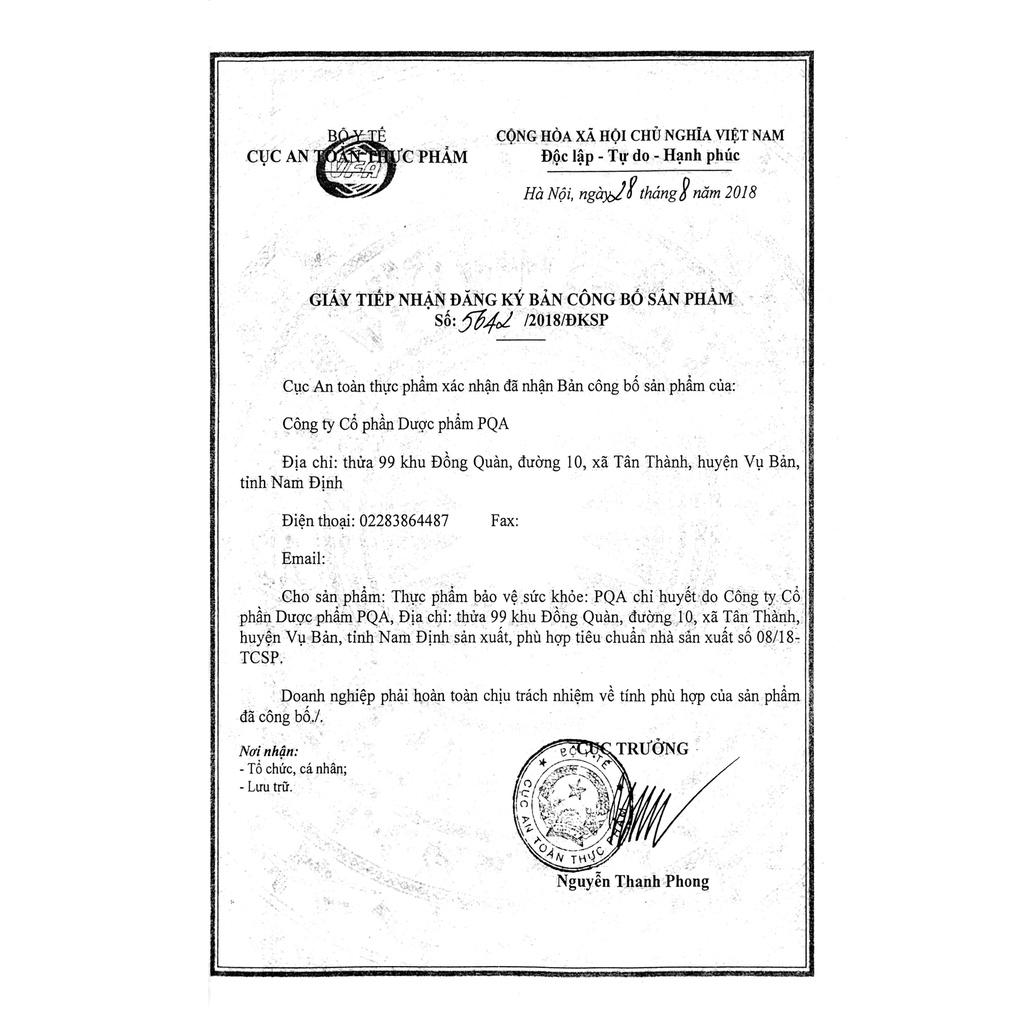 - Địa chỉ sản xuất: Công ty Cổ phần Dược phẩm PQA. Thửa 99, Khu Đồng Quàn, Xã Tân Thành, Huyện Vụ Bản, Tỉnh Nam Định. THÀNH PHẦN: