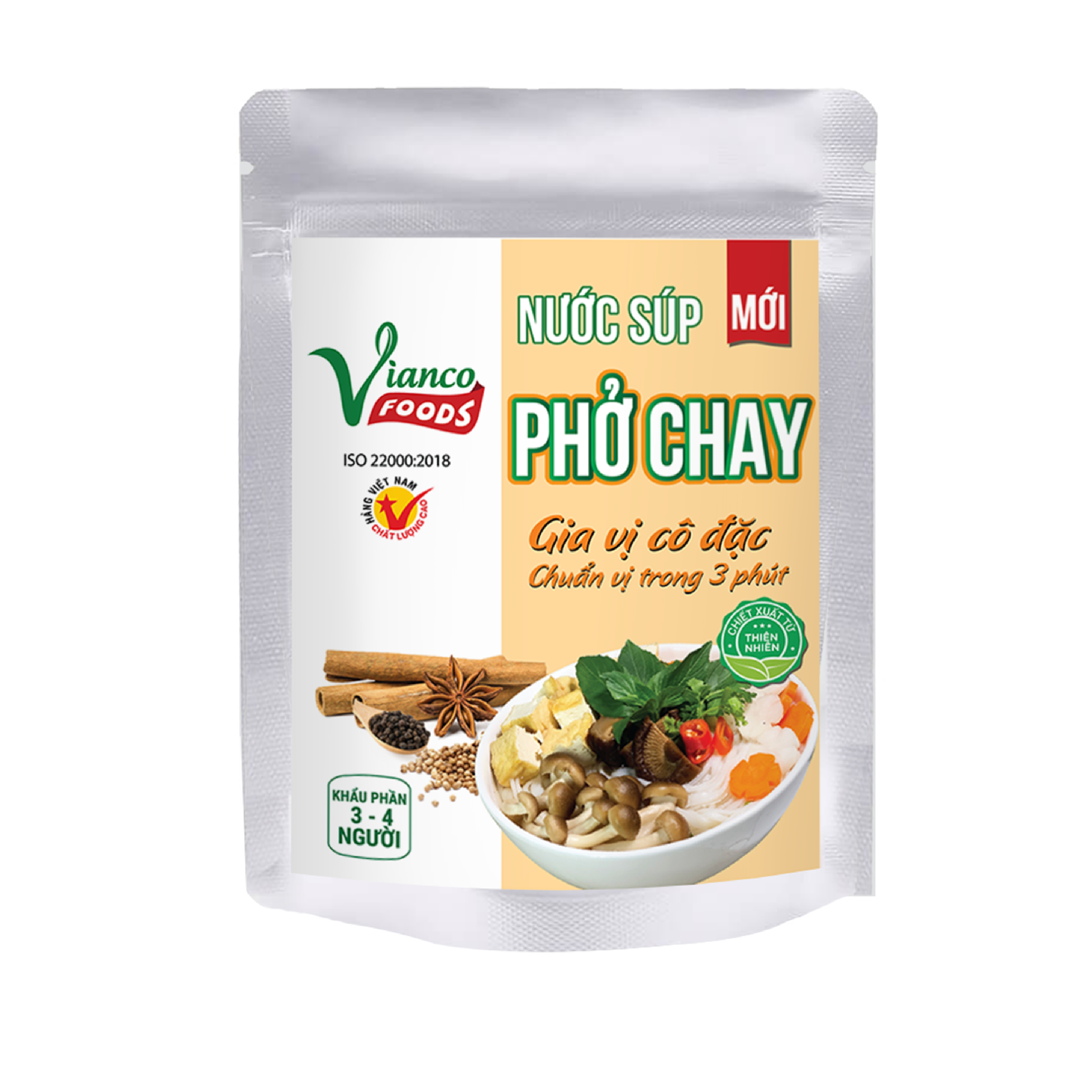 “Nước súp phở chay, gia vị cô đặc Vianco, chuẩn vị trong 3 phút” là sự kết hợp hòa quyện giữa các loại gia vị tạo nên hương vị Phở. Giúp việc nấu phở trở nên dễ dàng hơn nhưng vẫn đạt được độ chuẩn vị hoàn hảo.