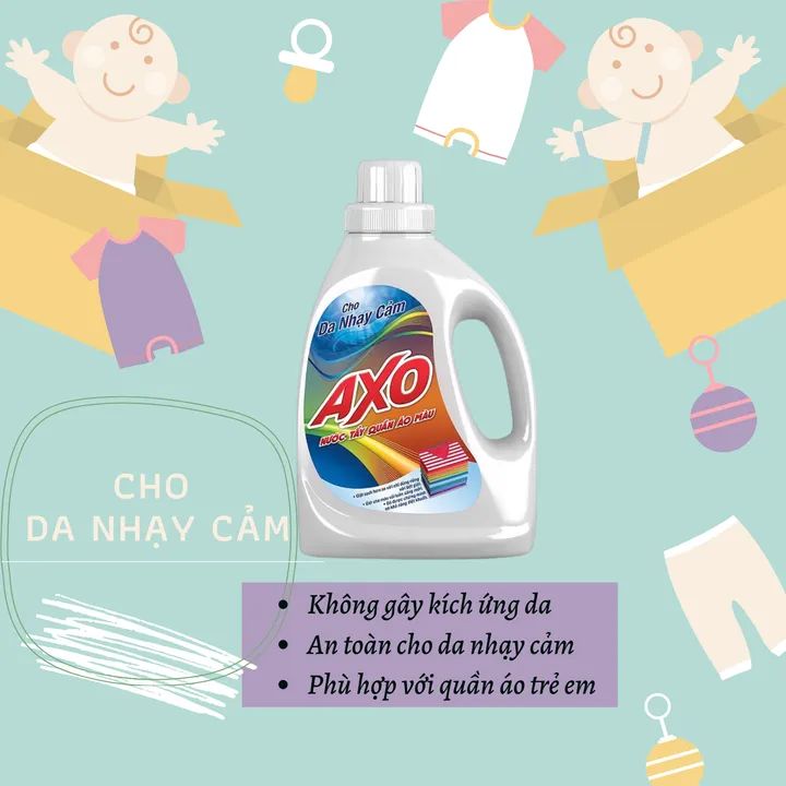 Nước Giặt Tẩy Quần Áo Màu AXO - Với công nghệ từ Philippines, AXO giúp tẩy sạch các vết bẩn trên quần áo màu như Cafe, Cari, dầu nhớt, vết mực, vết bút bi mà