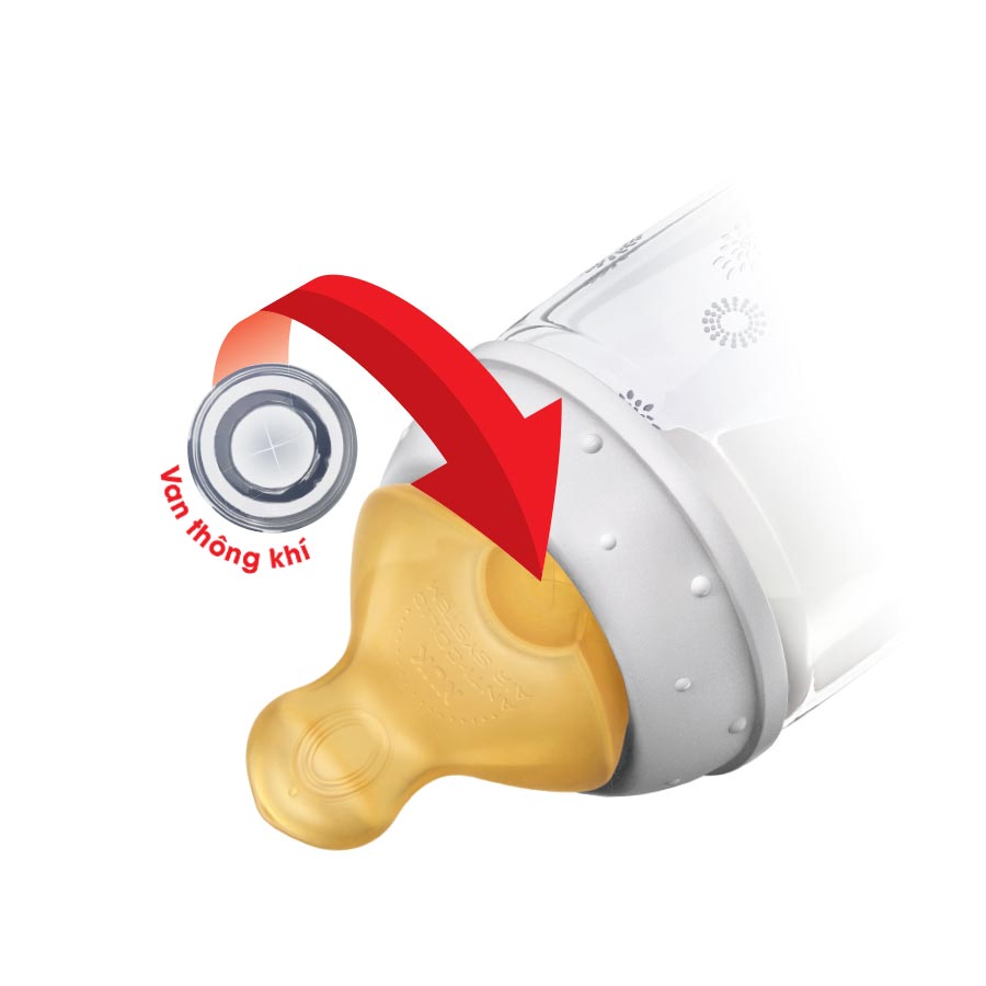 - Lỗ tiết sữa nằm ở mặt trên của núm ti: Tạo cơ chế phun sữa dạng vòng cung lên vòm miệng giúp trẻ tránh giật mình dẫn đến nghẹn sặc, không như các lỗ tiết sữa ở bình thông thường nằm giữa núm ti phun thẳng vào cổ họng bé. Bên cạnh đó, cơ chế phun sữa đặc biệt này còn giúp sữa có đủ thời gian để hòa với enzyme nước bọt của bé giúp tiêu hóa sữa tốt hơn.