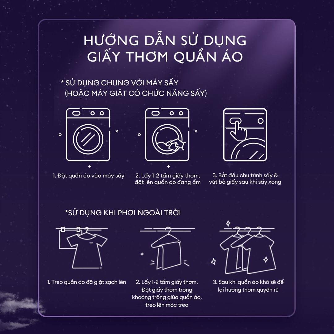 Cách dùng: Lấy 1 tờ mới đặt lên trên quần áo khi bắt đầu sấy. Vứt bỏ sau mỗi chu kỳ máy sấy. Cài đặt nhiệt độ thấp cho vải tổng hợp. Lưu ý: Trong trường hợp bị đốm, hãy làm ướt vải và chà bằng chất tẩy dạng lỏng rồi xả hoặc giặt lại.