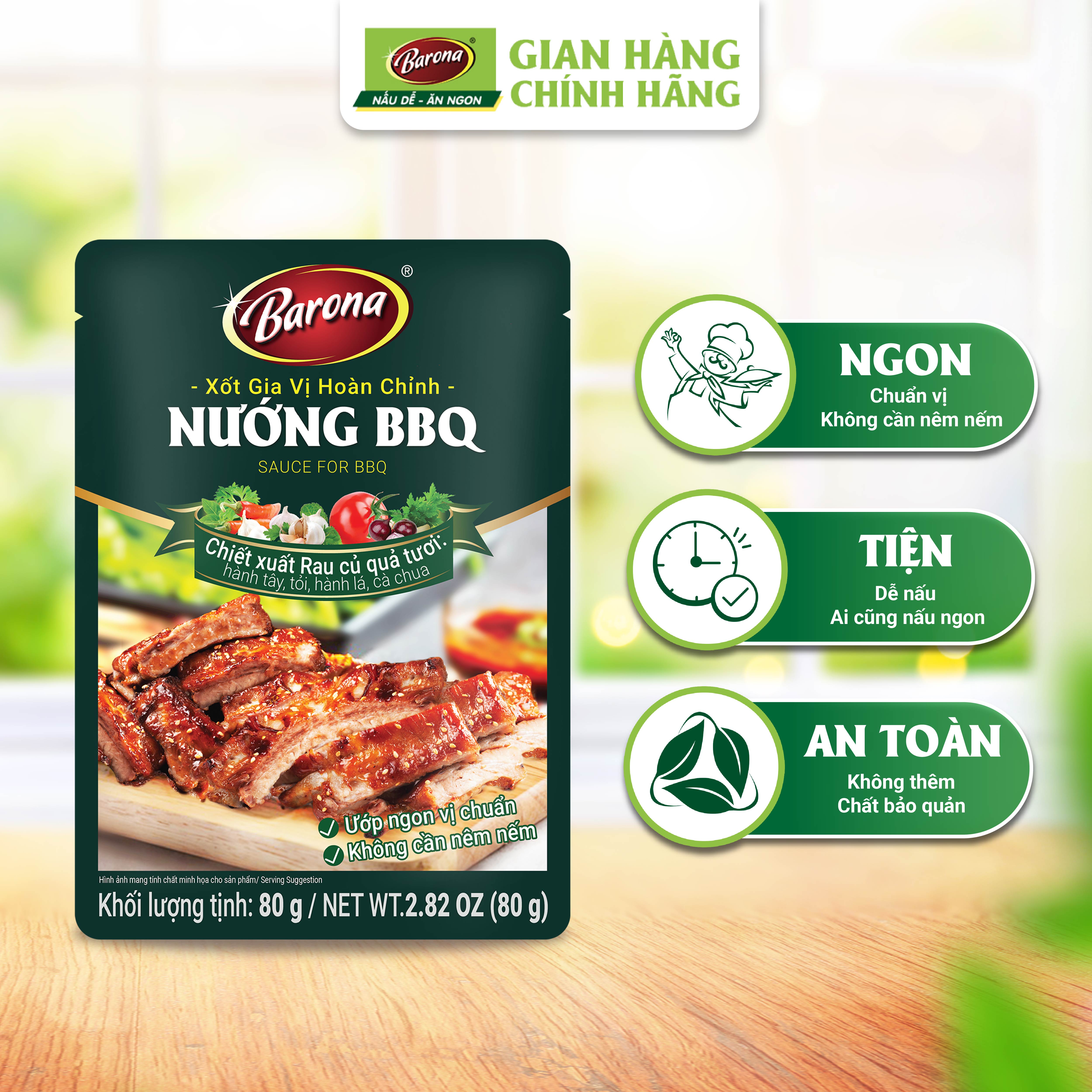 XỐT GIA VỊ HOÀN CHỈNH BARONA THỊT NƯỚNG XÁ XÍU 80G Xốt Gia Vị Hoàn Chỉnh Barona là công thức phối trộn độc đáo giữa CHIẾT XUẤT RAU CỦ QUẢ TƯƠI như hành, tỏi, me,