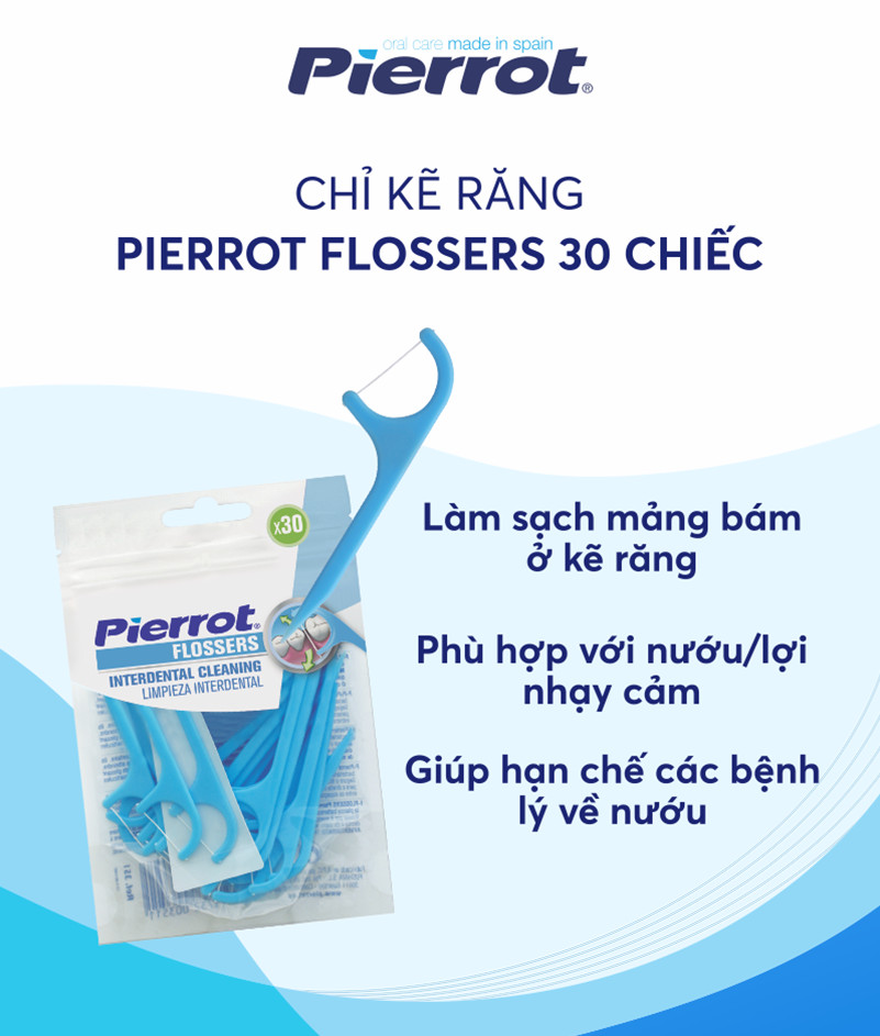 Chỉ kẽ răng PIERROT FLOSSERS với sợi chỉ chuyên biệt, tiệt trùng, giúp bạn loại bỏ dễ dàng các thức ăn thừa ở các kẽ răng, phòng ngừa bệnh nha chu, hôi miệng. Sản phẩm