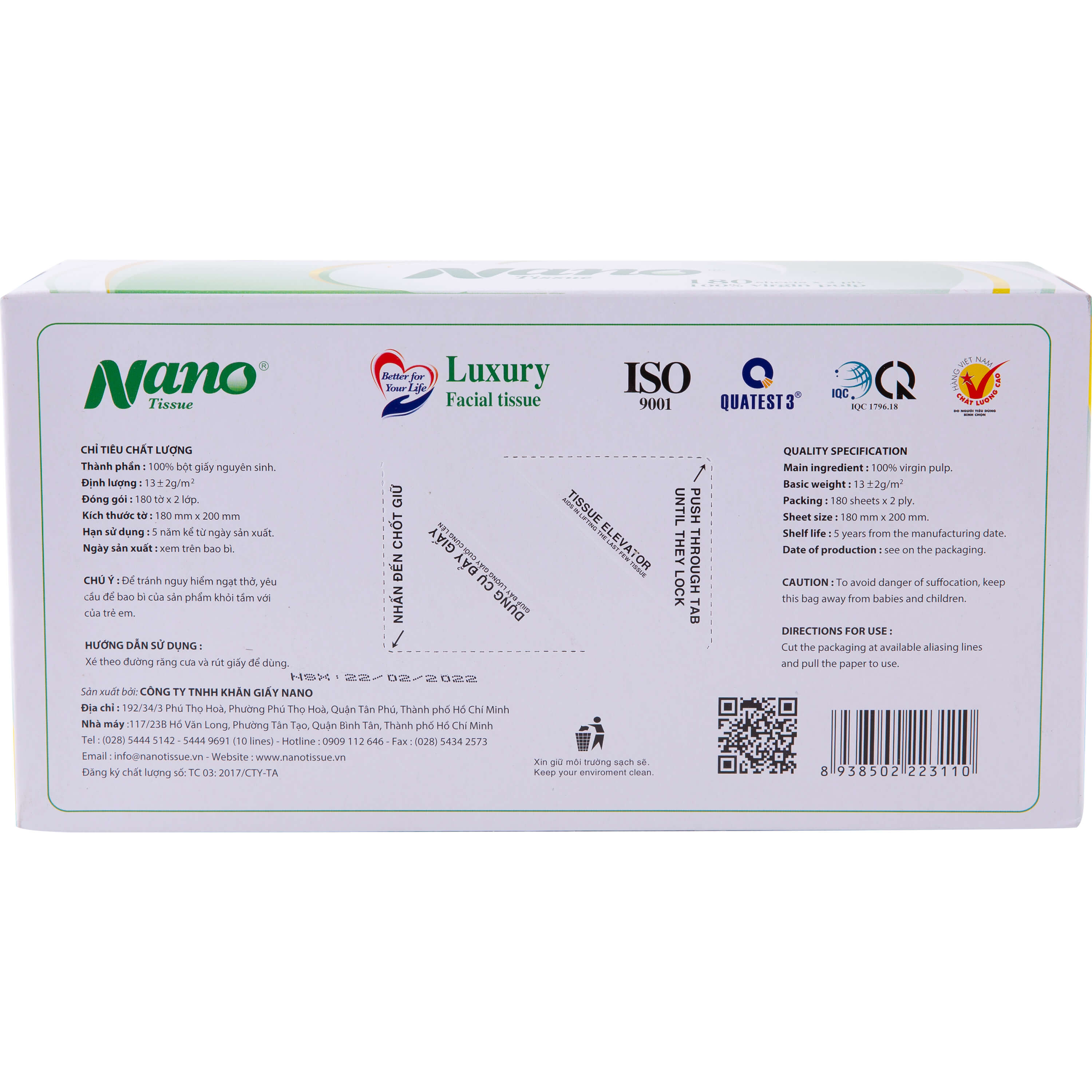 Thành phần 100% bột giấy nguyên thủy. Hướng dẫn sử dụng Mở hộp, rút từng tờ để sử dụng. Thông tin sản xuất Bảo quản: Nơi khô ráo, thoáng mát. Quy cách đóng gói: 180 tờ x 2 lớp, (200 x 190)