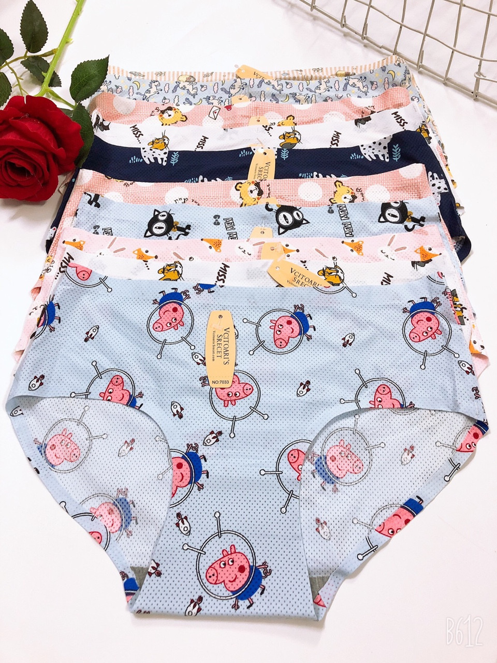 5 mẫu in độc đáo gồm mèo Kitty hồng, bé gấu hoạt hình, họa tiết trái tim, chấm bi pastel, họa tiết hoạt hình đa sắc—tăng độ “cute” cho tủ nội y.