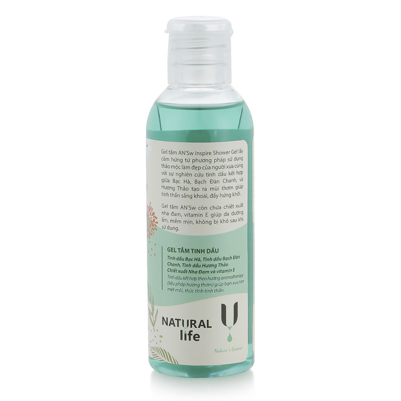 - Inspire (Tinh Dầu Bạch Đàn Chanh + Bạc Hà + Hương Thảo): mùi thơm tươi mát, sảng khoái, phấn chấn tinh thần. Gel tắm với sự kết hợp giữa tinh dầu và các tinh chất nha đam, vitamin E, Glycerin, giúp da được dưỡng ẩm và bổ sung khoáng chất. Cho bạn làn da khỏe mạnh, mịn màng và trắng sáng. Sản phẩm được làm từ thiên nhiên nên rất an toàn cho da. Không chứa các chất độc hại. Phù hợp với mọi loại da. Công dụng của sữa tắm AN’Sw