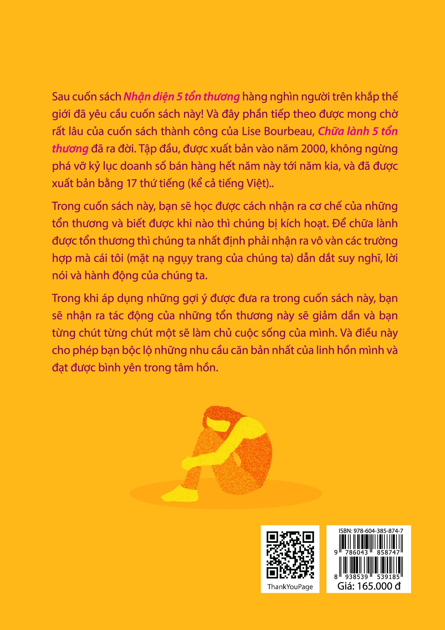 NHẬN DIỆN 5 TỔN THƯƠNG Cuốn sách mô tả những quan sát của tác giả trong hình thể, ngôn ngữ và lời nói của những người đang tái diễn tổn thương (với tổn thương nhục nhã, bị bỏ rơi, bị phủ nhận, bị phản bội, bị đối xử bất công). Nhờ những miêu tả trực giác này của tác giả mà chúng ta có thể phán đoán được một người đang bị ảnh hưởng nhiều bởi chấn thương cảm xúc nào, và việc tự đánh đồng chấn thương cảm xúc đầu đời ấy đã tác động lên cuộc đời họ, cách họ sinh hoạt, nói năng, cách họ đưa ra các lựa chọn của đời mình, và rồi được biểu hiện qua cơ thể ra sao. Qua những tổn thương đó, chúng ta thấy được mối quan hệ giữa mặt nạ vô thức ta mang trong quá trình đối phó với những tổn thương và biểu hiện của chúng trên cơ thể ta. Thông qua cuốn sách, chúng ta dần thấu hiểu tâm thức của con người và có thể rút ra được bài học cho chính mình trên hành trình “thành nhân” (theo cách nói của Carl Rogers) hay “thành toàn tự ngã” (theo cách nói của Carl Jung) của mỗi chúng ta.   CHỮA LÀNH 5 TỔN THƯƠNG Đây là cuốn sách rất được mong chờ sau thành công của Lise Bourbeau với cuốn sách “Nhận diện 5 tổn thương” được hàng nghìn người trên thế giới đón nhận. Trong cuốn sách này, bạn sẽ học được cách nhận ra cơ chế của những tổn thương và biết được khi nào thì chúng bị kích hoạt. Để chữa lành được tổn thương thì chúng ta nhất định phải nhận ra vô vàn các trường hợp mà cái tôi (mặt nạ nguỵ trang của chúng ta) dẫn dắt suy nghĩ, lời nói và hành động của chúng ta. Trong khi áp dụng những gợi ý được đưa ra trong cuốn sách này, bạn sẽ nhận ra tác động của những tổn thương này sẽ giảm dần và từng chút một bạn sẽ làm chủ cuộc sống của mình. Và điều này cho phép bạn bộc lộ những nhu cầu căn bản nhất của linh hồn mình và đạt được bình yên trong tâm hồn.  Giới thiệu tác giả: Lise Bourbeau Lise Bourbeau là tác giả nổi tiếng toàn cầu, bà đã viết 20 cuốn sách, trong đó có nhiều đầu sách best-seller về chủ đề lắng nghe cơ thể và nhận diện những tổn thương bên trong. Sách của bà được dịch ra gần 20 ngôn ngữ trên thế giới. Từ khi thành lập trường phái nghiên cứu của mình vào năm 1982, những tư tưởng của bà đã giúp đỡ rất nhiều người cải thiện chất lượng cuộc sống và tạo ra những thay đổi bền vững hàng ngày. Lắng nghe cơ thể bạn, trường phái phát triển bản thân có sức ảnh hưởng lớn nhất ở Quebec, đã được truyền bá trong các buổi hội thảo trên hơn 20 quốc gia và trong 10 thứ ngôn ngữ. Bộ sách “Nhận diện 5 tổn thương” và “Chữa lành 5 tổn thương” là hai trong số rất nhiều đầu sách best-seller của bà. Thông tin sách: