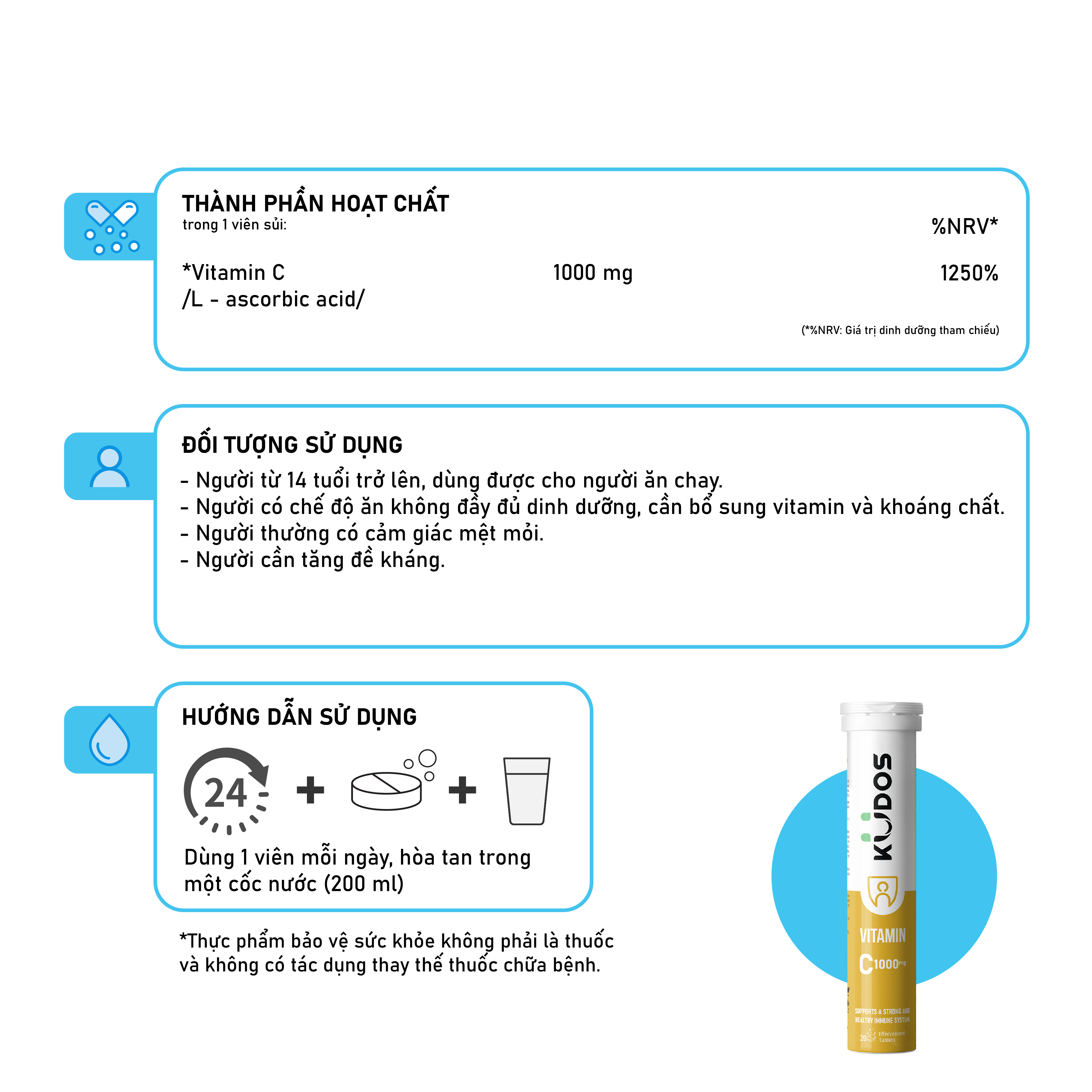 - Viên Sủi KUDOS VITAMIN C 1000MG Trong mỗi viên sủi 4,1 g chứa: Vitamin C (Acid L-ascorbic): 1000 mg Đối tượng sử dụng: Người lớn và trẻ em từ 14 tuổi trở lên có nhu cầu bổ sung vitamin. Hướng dẫn sử dụng: Dùng 1 viên mỗi ngày, hòa tan trong một cốc nước (200 ml) Bảo quản: Bảo quản dưới 25oC ở nơi khô ráo và đậy nắp kín Chú ý: • Thực phẩm này không phải là thuốc, không có tác dụng thay thế thuốc chữa bệnh. • Không dùng cho người mẫn cảm, kiêng kỵ với bất cứ thành phần nào của sản phẩm. • Phụ nữ có thai, đang cho con bú, người bị viêm loét dạ dày, tá tràng, nên tham khảo ý kiến bác sĩ, chuyên gia y tế trước khi dùng. • Không dùng quá liều khuyến nghị hàng ngày. • Không phù hợp cho trẻ em dưới 14 tuổi. Để xa tầm tay trẻ nhỏ. • Không dùng sản phẩm sau ngày hết hạn. • Sản phẩm là thực phẩm bảo vệ sức khỏe chứa vitamin, khoáng chất và chất tạo ngọt. • Thực phẩm bảo vệ sức khỏe không thay thế cho chế độ ăn uống đa dạng cân bằng và lối sống lành mạnh. • Sản phẩm không chứa lactose, gluten và thân thiện với người ăn chay. Thời hạn sử dụng: 36 tháng kể từ ngày sản xuất NSX, HSD: Xem “MFD” và “EXP” ở đáy tuýp. Xuất xứ: Đức