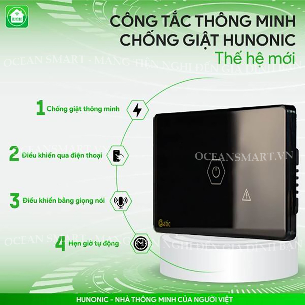 Dòng công tắc chống giật Hunonic có mẫu mã tương tự công tắc cảm ứng công suất lớn, với mặt kính cường lực và viền bo cong. Cách lắp đặt và sử dụng tương tự các công tắc cảm ứng thông minh Hunonic