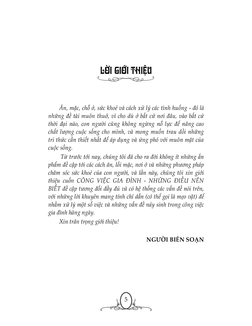 Từ trước tới nay, chúng tôi đã cho ra đời không ít những ấn phẩm đề cập tới các cách ăn, lối mặc, nơi ở và những phương pháp chăm sóc sức khoẻ của con người, và lần này, chúng tôi xin giới thiệu cuốn CÔNG VIỆC GIA ĐÌNH - NHỮNG ĐIỀU NÊN BIẾT đề cập tương đối đầy đủ và có hệ thống các vấn đề nói trên, với những lời khuyên mang tính chỉ dẫn (có thể gọi là mẹo vặt) đế nhằm xử lý một số việc và những vấn đề nảy sinh trong công việc gia đình hàng ngày.