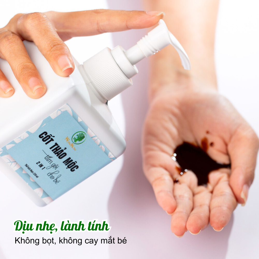 - Cốt thảo mộc tắm và gội cho bé Wonmom với nguyên liệu thảo mộc thiên nhiên: chiết xuất trầu không, khổ qua, trà xanh, kim ngân, sài đất, tràm trà ️ Đặc biệt, sản phẩm dịu nhẹ, không bọt, không làm cay mắt bé nên an toàn cho bé yêu!