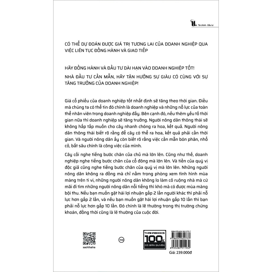 - Trên đời này không có gì miễn phí cả. May mắn cũng chỉ một hoặc hai lần. Phải chăm chỉ học hỏi và trao đổi với doanh nghiệp. Thay vì ngồi dán mắt vào màn hình để theo dõi sự lên xuống của giá cổ phiếu, dùng thời gian đó đọc sách thì sẽ hiệu quả hơn cả trăm lần. Có nhiều người nghe giảng về chứng khoán thì không hề quan tâm gì đến triết lý đầu tư của diễn giả mà chỉ chờ hết giờ để hỏi danh mục đầu tư nào tốt. Nghe giảng thì tốt nhưng phải học được triết lý đầu tư của diễn giả chứ đừng chỉ quan tâm đến danh mục đầu tư. Nếu chỉ vì để tìm danh mục đầu tư thì thà rằng khoảng thời gian đó dành đi đến thăm và tìm hiểu về doanh nghiệp sẽ hiệu quả hơn. Làm như thế, tỉ lệ thành công sẽ cao hơn. Như ông bà ta dạy rằng cây cối nghe tiếng chân của chủ nhân mà lớn. Doanh nghiệp cũng nghe tiếng chân của cổ đông mà lớn. Và nguồn vốn của bạn cũng nghe tiếng bước chân bạn mà lớn. Không có người nông dân nào thành công dù không ra ruộng thăm lúa mà chỉ nằm nhà quan sát ruộng đồng, không có người nông dân nào thành công chỉ nhờ vào việc chạy theo hỏi thăm những người nông dân nổi tiếng cả. Nếu muốn thu lợi nhuận hơn gấp hai lần những người khác thì bạn phải nỗ lực hơn gấp hai lần. Nếu bạn muốn thu lợi nhuận gấp 10 lần người khác thì bạn phải nỗ lực hơn họ 10 lần. Đó chính là đạo lý của thị trường chứng khoán và là đạo lý của cuộc đời Công ty Cổ phần Sách Thái Hà trân trọng giới thiệu!
