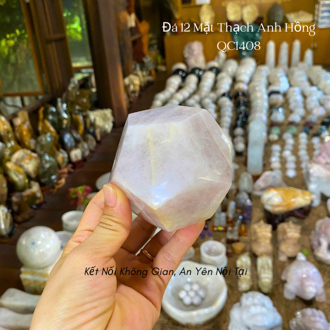 - Trưng bày viên đá ở những nơi bạn cảm thấy cần sự bình yên và năng lượng yêu thương. Đừng bỏ lỡ cơ hội sở hữu đá 12 mặt thạch anh hồng QC1408, người bạn đồng hành tuyệt vời trên hành trình tìm kiếm sự an yên và cân bằng trong tâm hồn!