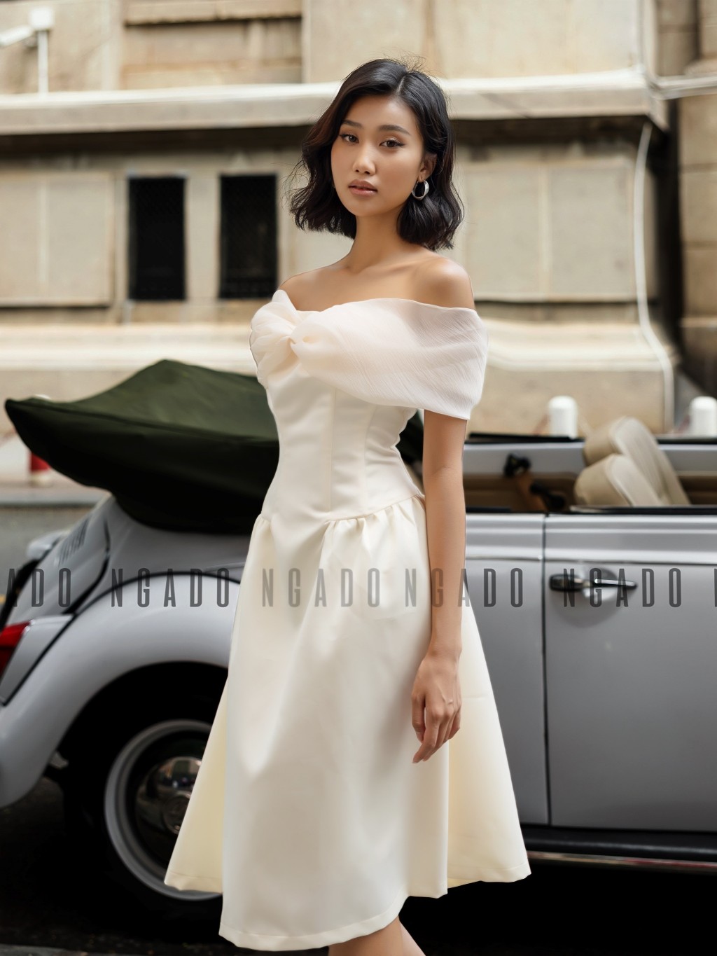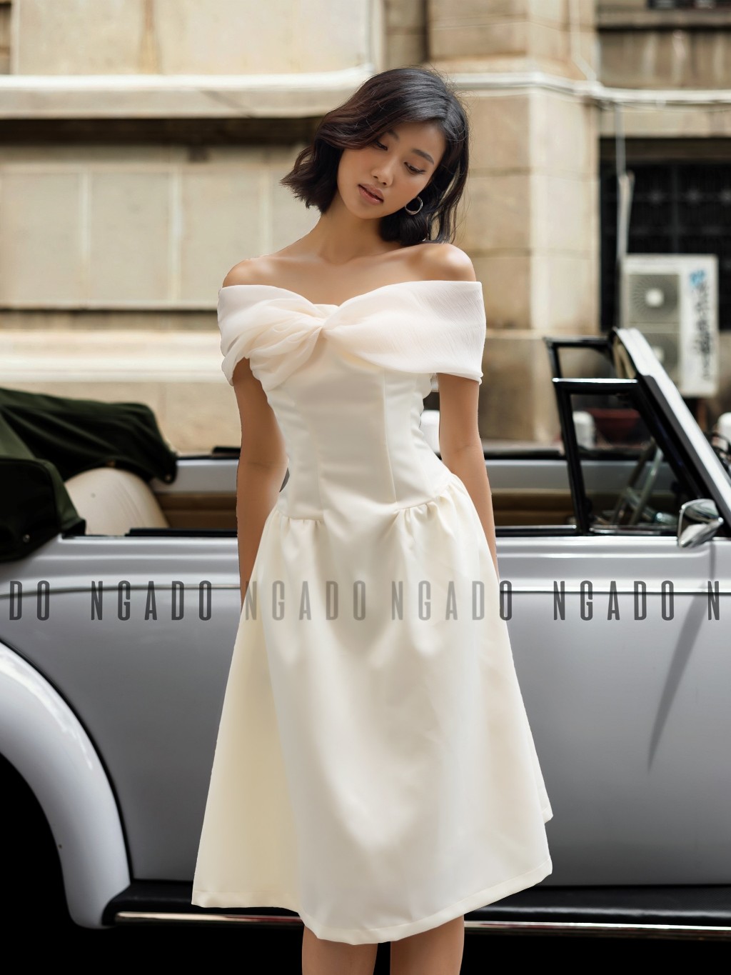 ✨Đầm bẹt vai phối voan kem NGADO, Đầm dự tiệc sang chảnh, Đầm hở vai