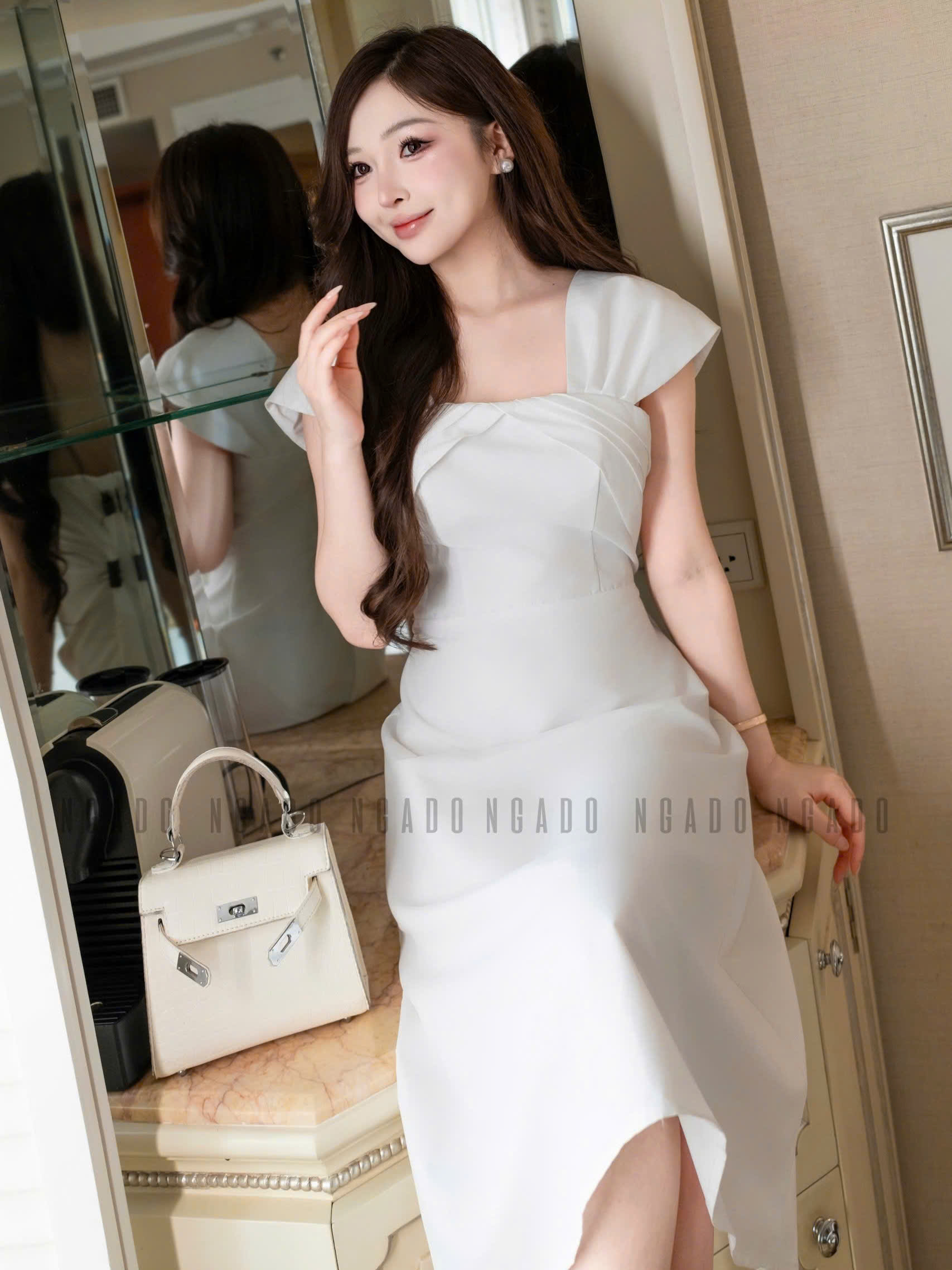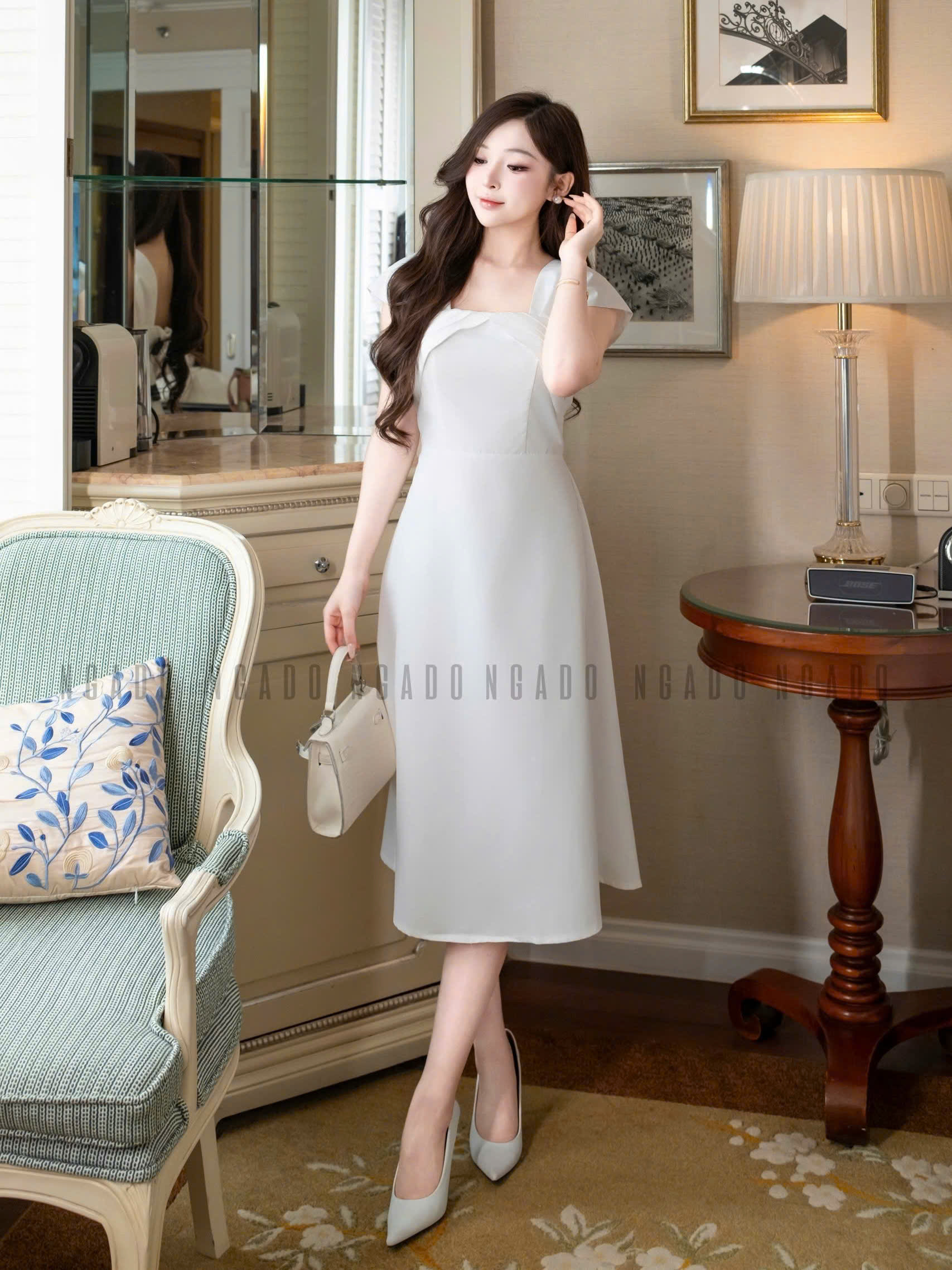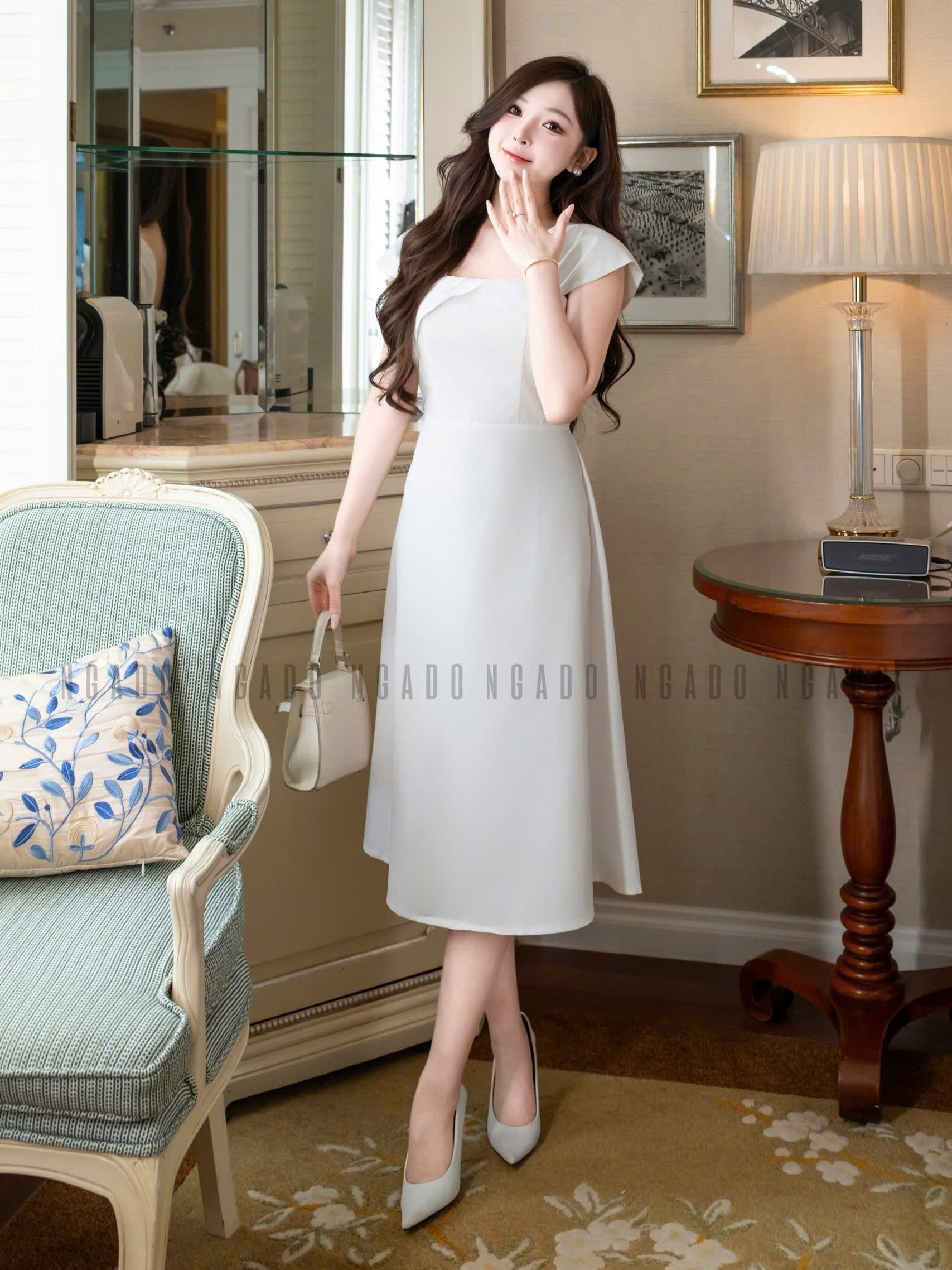 ✨Đầm gấm trắng tay con NGADO , đầm dự tiệc hở vai