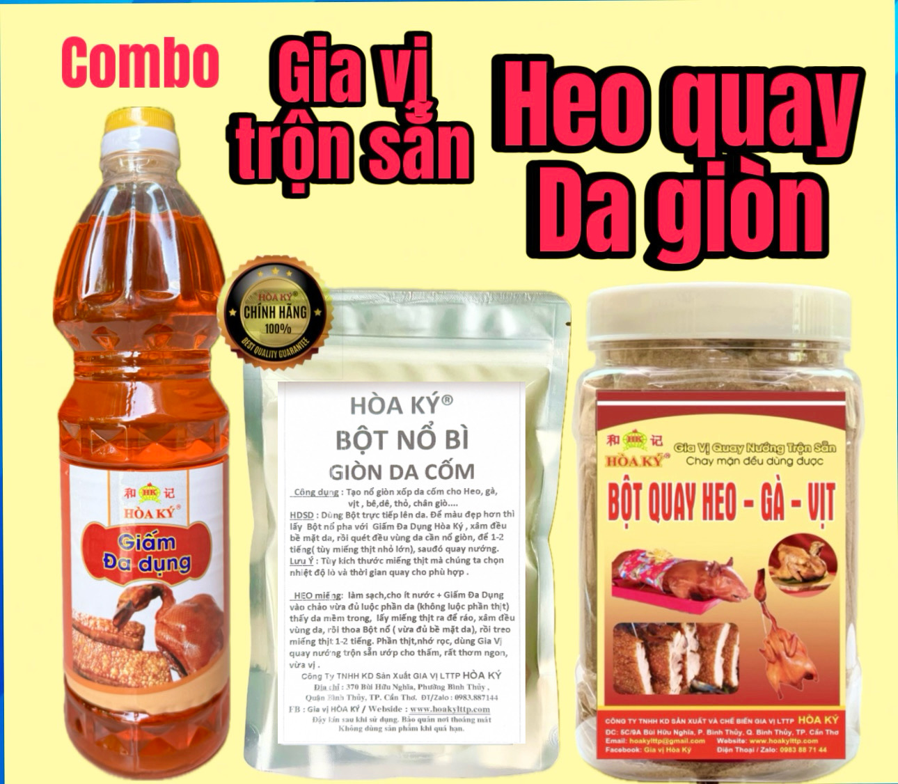 BỘT NỔ BÌ GIÒN DA CỐM Combo quay nướng đầy đủ gia vị, không cần nêm thêm. Gồm có : Bột nổ bì giòn da cốm Gia vị trộn sẵn ướp phần thịt Giấm (Dấm) đa dụng tạo màu đẹp ,da giòn . Thực phẩm : cho Heo, gà,  vịt , bê,dê, thỏ, chân giò, chim bồ câu ….tạo nổ giòn xốp da cốm, thịt thấm vừa ăn thơm ngon .   Công dụng của Bột : Tạo nổ giòn xốp da cốm cho Heo, gà,  vịt , bê,dê, thỏ, chân giò.... HDSD : Dùng Bột trực tiếp lên da để nổ bì da . Quay da bóng giòn màu đẹp thì lấy  Bột  nổ pha với  Giấm Đa Dụng Hòa Ký ; xâm đều bề mặt da, rồi quét đều vùng da cần nổ giòn, để 1– 2 tiếng hong gió ( tùy miếng thịt nhỏ lớn), sau đó quay nướng. Lưu Ý : Tùy kích thước miếng thịt mà chúng ta chọn nhiệt độ lò và thời gian quay cho phù hợp .   HEO miếng:  làm sạch miếng thịt heo. Rồi cho (ít nước + ít Giấm Đa Dụng ) vào chảo vừa đủ luộc phần da  miếng thịt (không luộc phần thịt) thấy da mềm trong là lấy ra để ráo, xâm đều vùng da. Sau đó thoa Bột Nổ (vừa đủ) trực tiếp lên phần da ,hong gió 1– 2tiếng, rồi mới quay nướng. Phần thịt,nhớ rọc, dùng Gia Vị quay nướng trộn sẵn ướp cho thấm, rất thơm ngon.   Dùng gia vị ít hay nhiều đều được ( tuỳ khẩu vị) . Dùng được cho món Chay.