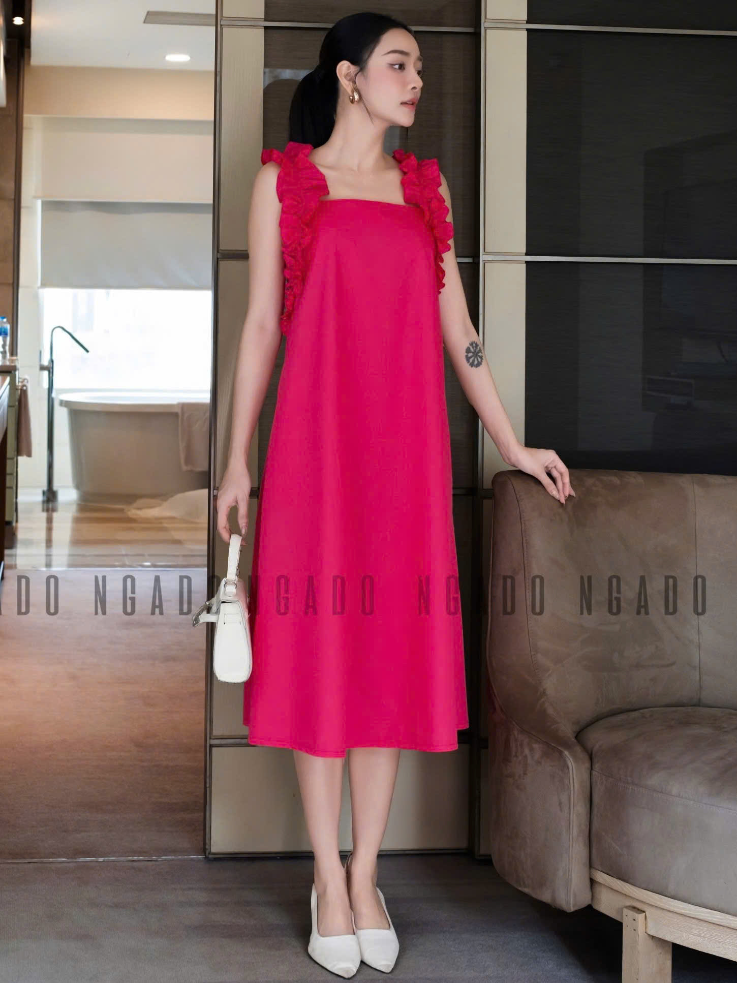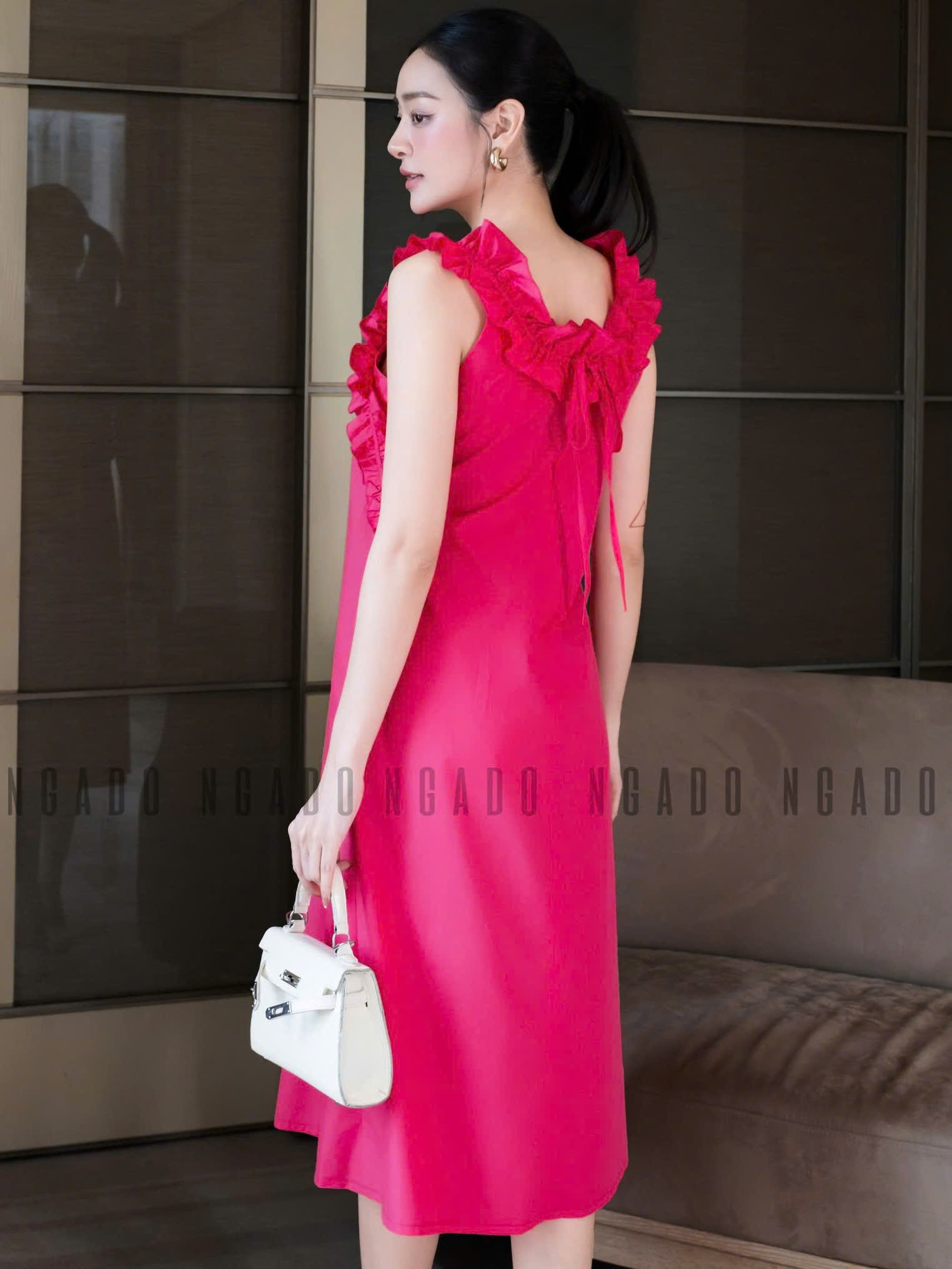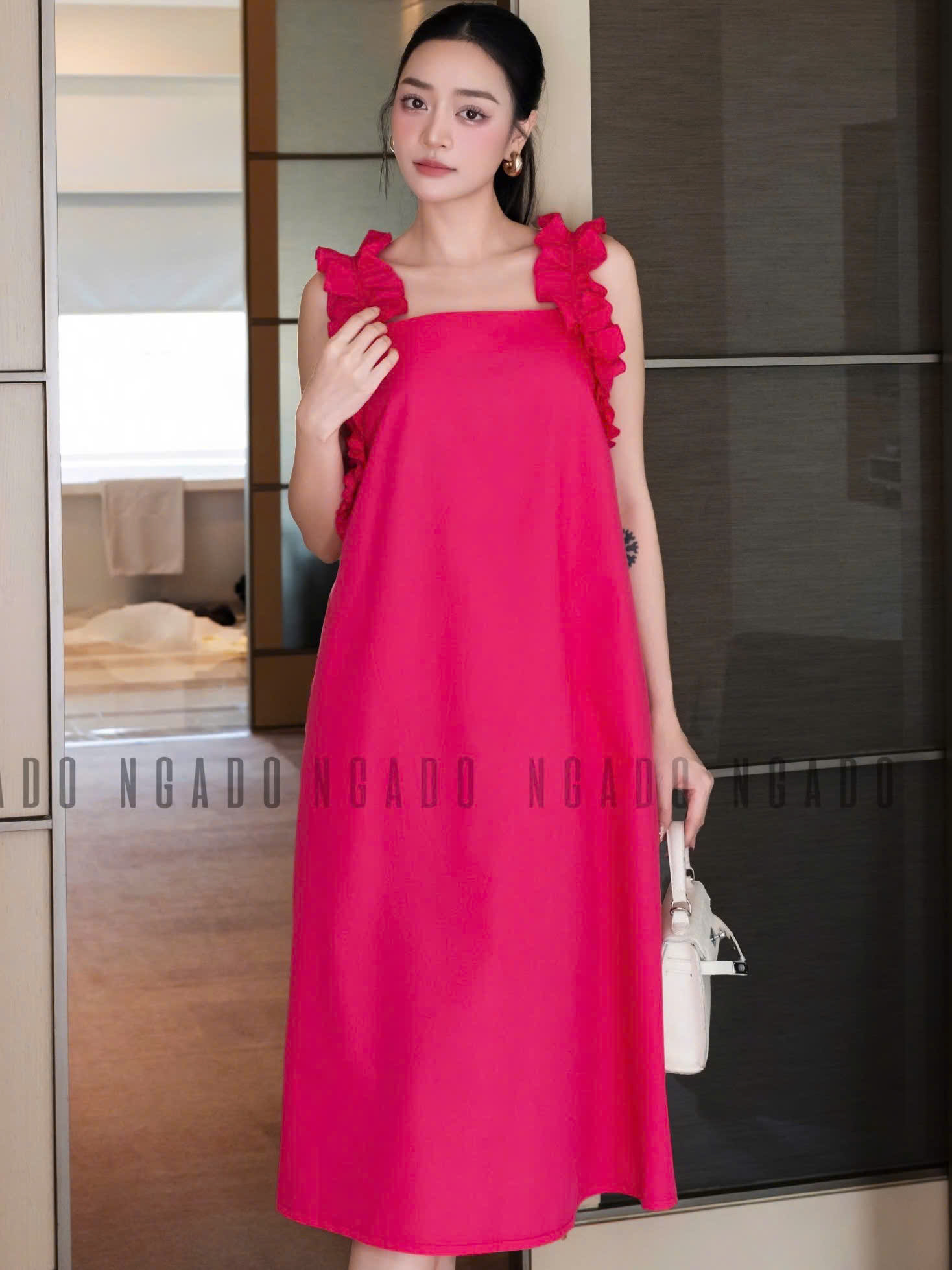 ✨Đầm hồng sen nhún vai NGADO , đầm suông , đầm dài