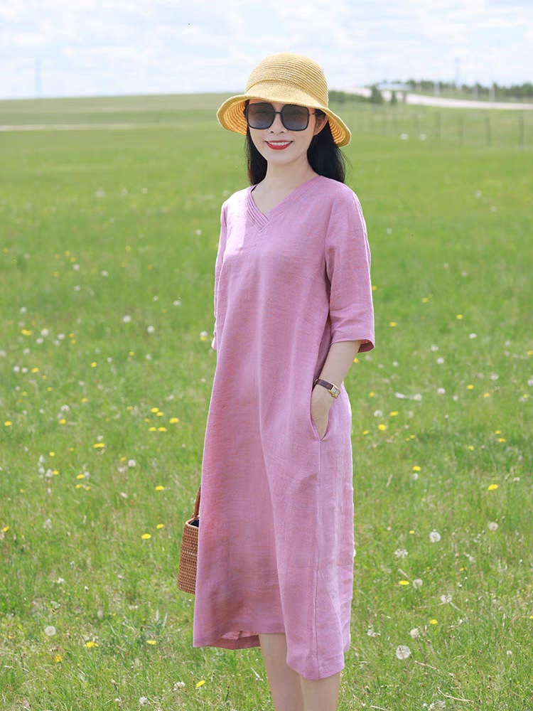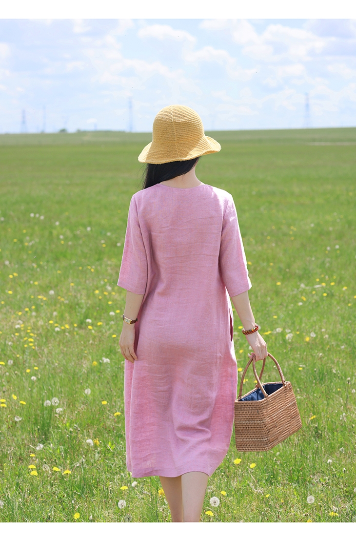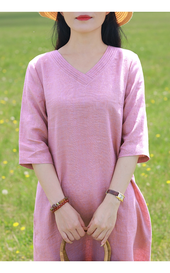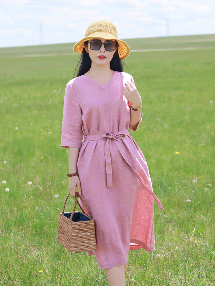 ✨Đầm linen nữ dáng suông thắt eo cổ tim, tay lỡ, chất linen mềm màu hồng nữ tính mẫu hè mới Haint Boutique