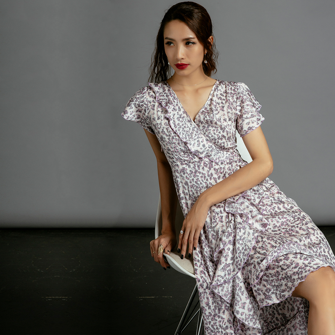 Đầm Midi Đắp Vạt mang một chút hơi thở cổ điển vintage trong thiết kế với những điểm xuyến bèo nhún thướt tha. Trên nền satin in hoạ tiết da beo nhí, chiếc Đầm Midi Đắp Vạt lại thổi hồn tự do hoang dã.