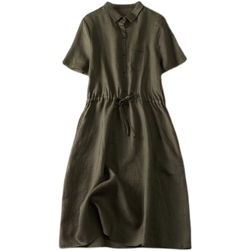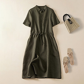 ✨Đầm sơ mi ulzzang suông nữ, Đầm linen thời trang hè nữ kèm đai eo màu xanh rêu Haint Boutique HB75