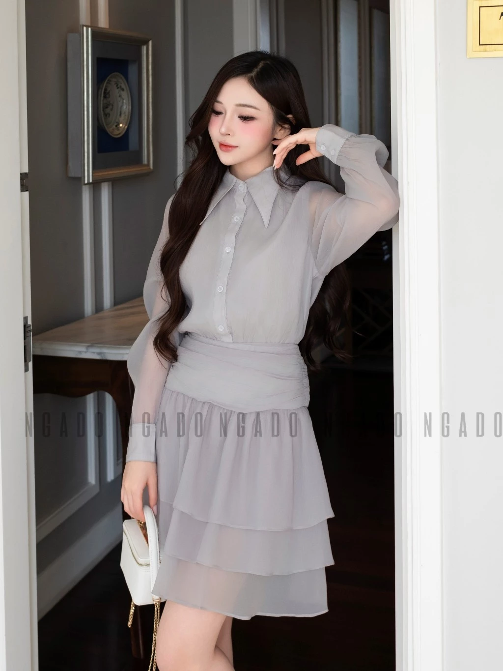 ✨Đầm xám phối voan NGADO , đầm sơ mi , đầm dài tay