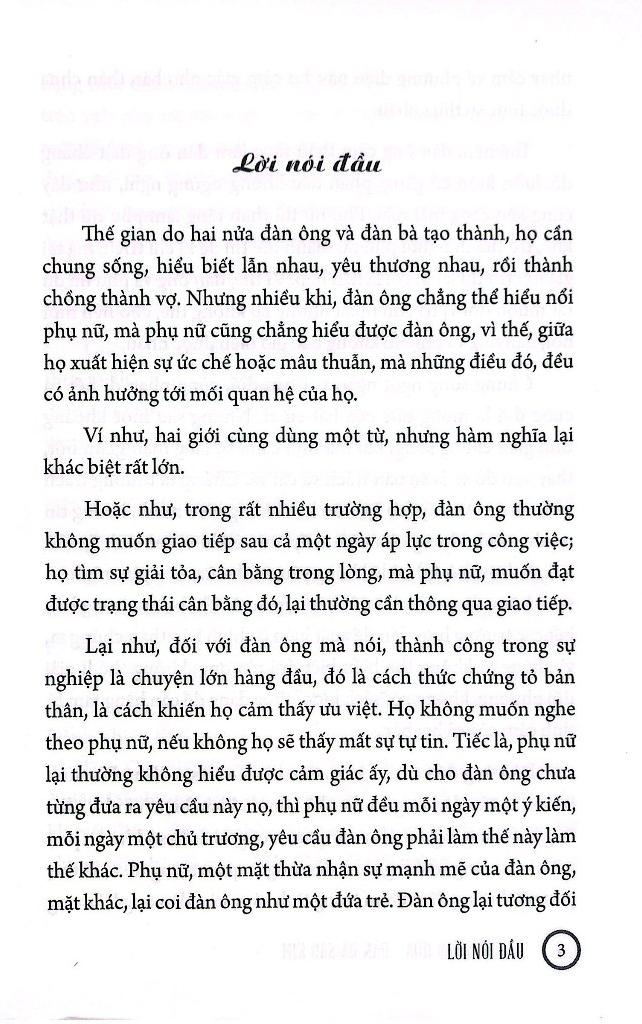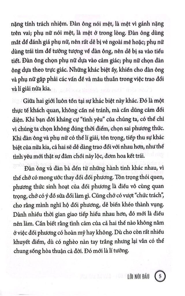 Mua tại TiktokHầu hết vấn đề xảy ra trong mối quan hệ giữa đàn ông và phụ nữ là kết quả của sự khác biệt tâm lý cơ bản giữa hai giới . Đối mặt với nó ra sao và giải quyết như thế nào luôn là mối quan tâm trăn trở của tất cả mọi người . Dù bạn đang yêu hay đã kết hôn , cuốn sách này sẽ đóng vai trò to lớn phân tích và đưa ra kỹ năng tôn trọng nhu cầu hay cảm nhận của đối phương , từ đó cải thiện mối quan hệ muôn thuở giữa "người sao Hoả " và " người sao Kim " .