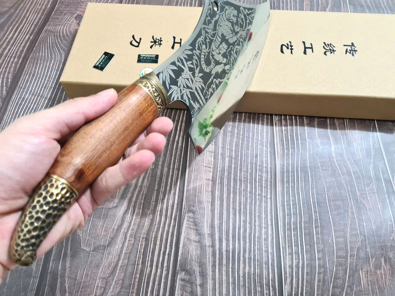 Dao Phúc Sen Chặt Xương Cán Cẩm Khâu Đồng - Kích thước: lưỡi: 24cm, cán: 13cm, rộng: 10cm, dầy: 0,5, trọng lượng: 700g - 900g - Chức năng: sử dụng chuyên chặt xương ống, xưởng