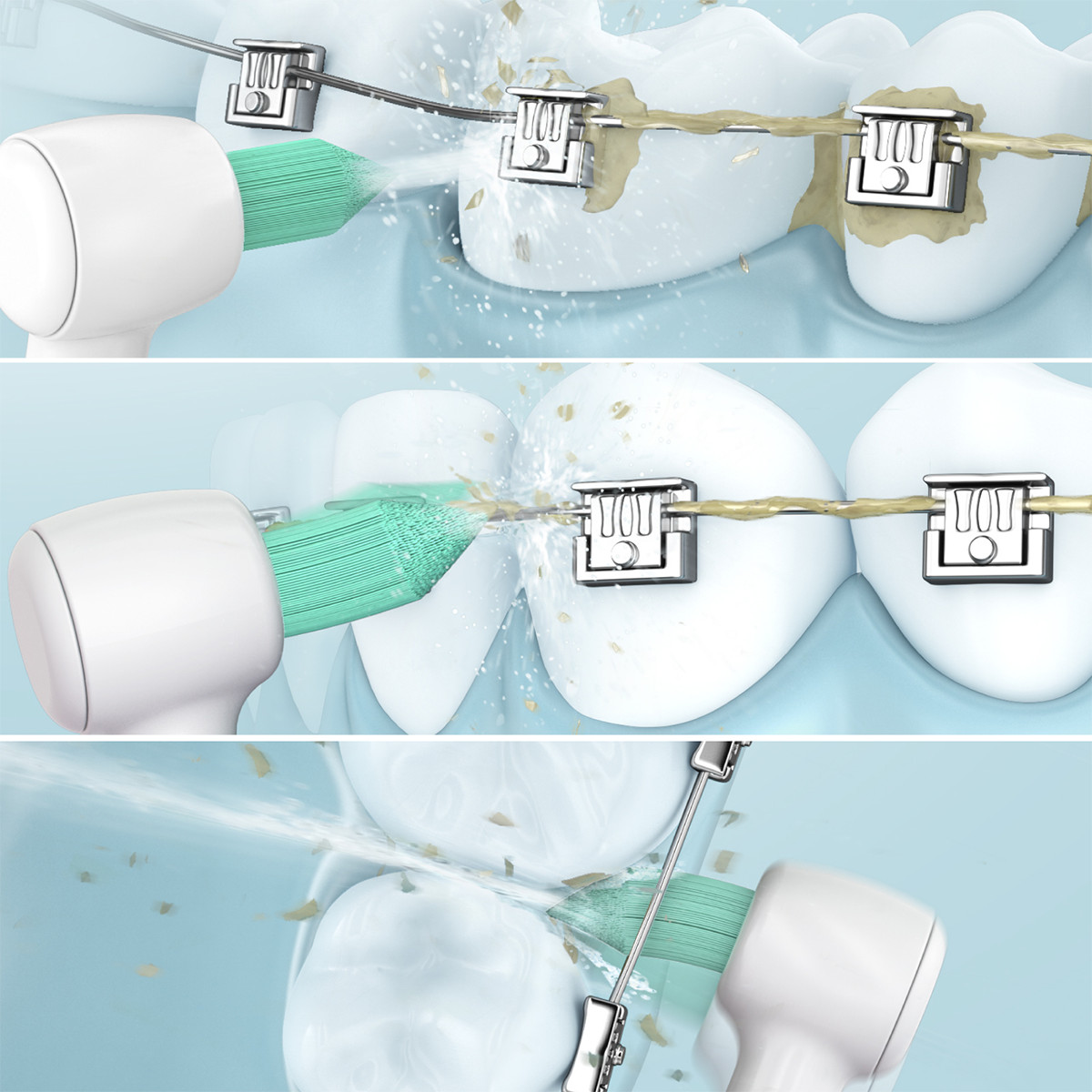 - Đầu dẫn nước bằng cao su mềm tác động nhẹ nhàng trên nướu. - Dễ dàng tháo lắp trên tay cầm - Làm sạch răng kỹ lưỡng. - Làm trôi mảng bám trên tối