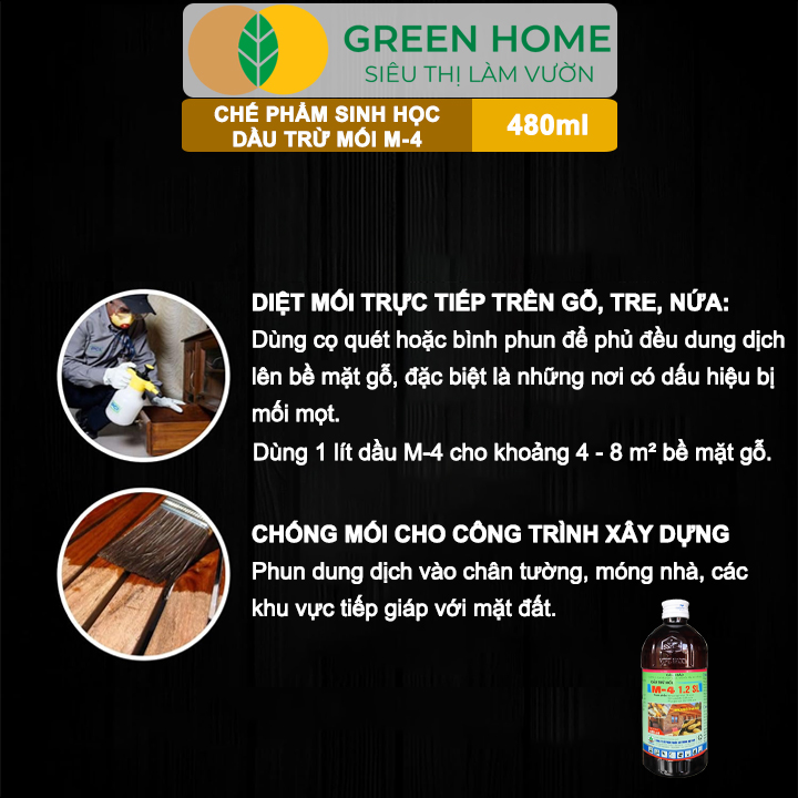 - Sản phẩm không gây hoen ố, đổi màu bề mặt gỗ, giữ nguyên vẻ đẹp tự nhiên cho vật liệu. Dầu Trừ Mối M-4 1.2SL GreenHome, Vipesco, Chai 480ml, Đặc Trị Mối Ăn Gỗ Đồ Nội Thất,Công Trình Đặc trị mối, mọt cho gỗ, tre, nứa, giúp xử lý cả gỗ đã bị phá hoại và phòng ngừa cho gỗ mới. Dùng ngay trực tiếp, không cần pha chế phức tạp, chỉ cần quét hoặc phun lên bề mặt gỗ. MÔTẢ SẢN PHẨM: