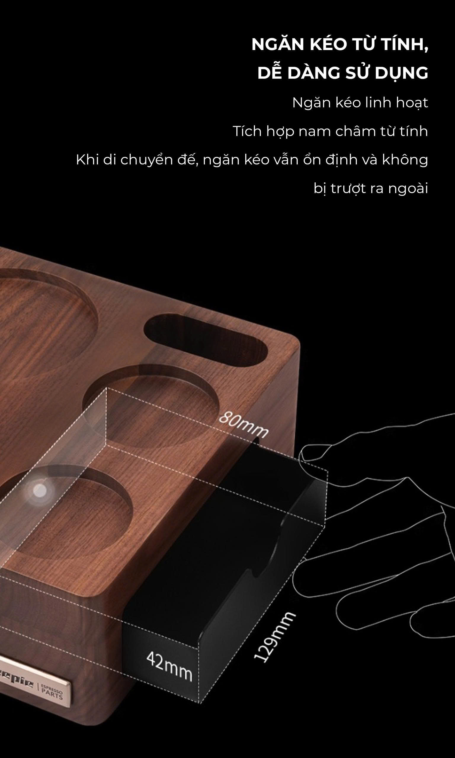 TẠI SAO BẠN NÊN CHỌN ĐẾ NÉN CÀ PHÊ GỖ ÓC CHÓ NAM MỸ? ️ Gỗ óc chó Nam Mỹ cao cấp, nổi bật với vân gỗ đẹp tự nhiên, độ bền cao, chống cong vênh, chịu lực tốt. ️ Bề mặt nhẵn mịn, không bám bẩn, chống thấm nước, giữ vệ sinh tối đa trong quá trình pha chế. ️ Dùng được cho hầu hết các loại tay cầm từ 51mm đến 58mm trên thị trường. ️ Hỗ trợ barista nén cà phê dễ dàng hơn, cân bằng hơn, tăng hiệu suất pha chế. ️ Thiết kế dựa trên chủng loại & kích thước của các thiết bị pha chế thông dụng. Tích hợp nhiều chức năng trong một sản phẩm như: Giá đỡ tay cầm nén cà phê Đỡ tamper, OCD,Kim Xoay(WDT) Ngăn đựng dụng cụ vệ sinh máy ️ Ngăn kéo linh hoạt với tích hợp nam châm từ tính giúp cố định chắc chắn. Khi di chuyển đế, ngăn kéo không bị trượt ra ngoài. ️ Đi kèm đai ốc điều chỉnh chiều cao, giúp tùy chỉnh phù hợp với nhiều loại tay cầm khác nhau. ️ Đế đỡ tương thích với hầu hết các loại tay cầm trên thị trường. ️ Tích hợp khe nhựa bảo vệ ngăn ngừa trầy xước đế khi sử dụng, ổn định và chống trầy.