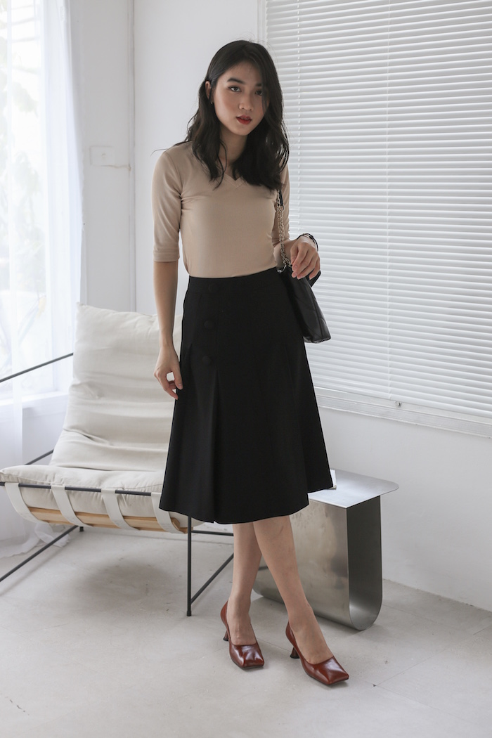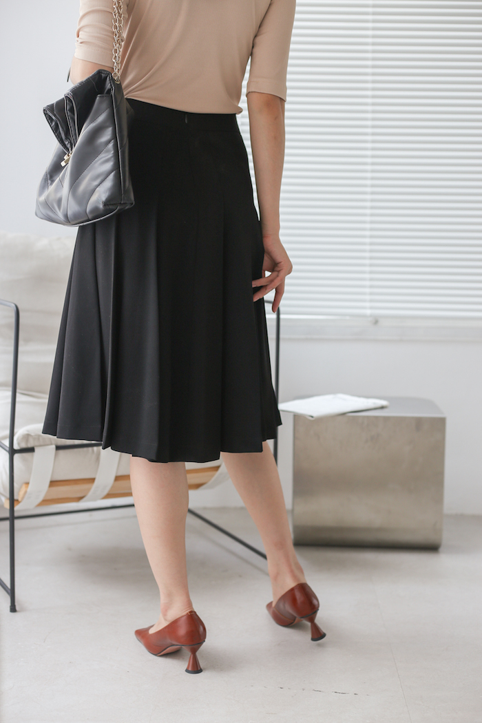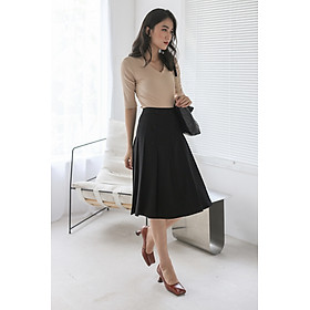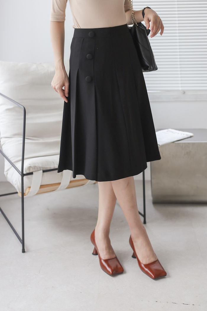 ✨De Leah - Chân Váy Midi Xếp Li Cúc Bọc - Đen