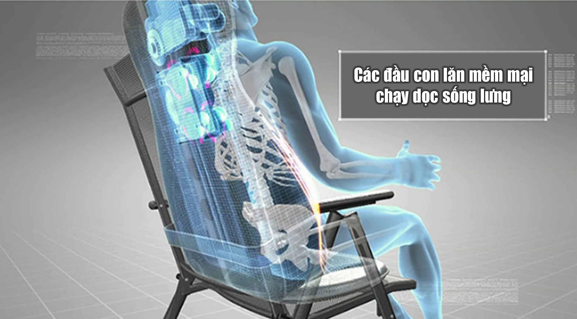– Phần lưng: Với 4 con lăn cơ học và 8 đầu massage kết hợp sử dụng cộng nghệ day ấn huyệt sẽ kích thích xoa bóp, giúp giảm lực chèn ép lên đĩa đệm, dây chằng và tủy sống giúp giảm đau lưng, giải tỏa căng thẳng tích tụ trên lưng đem lại cảm giác thư giản thoải mái.
