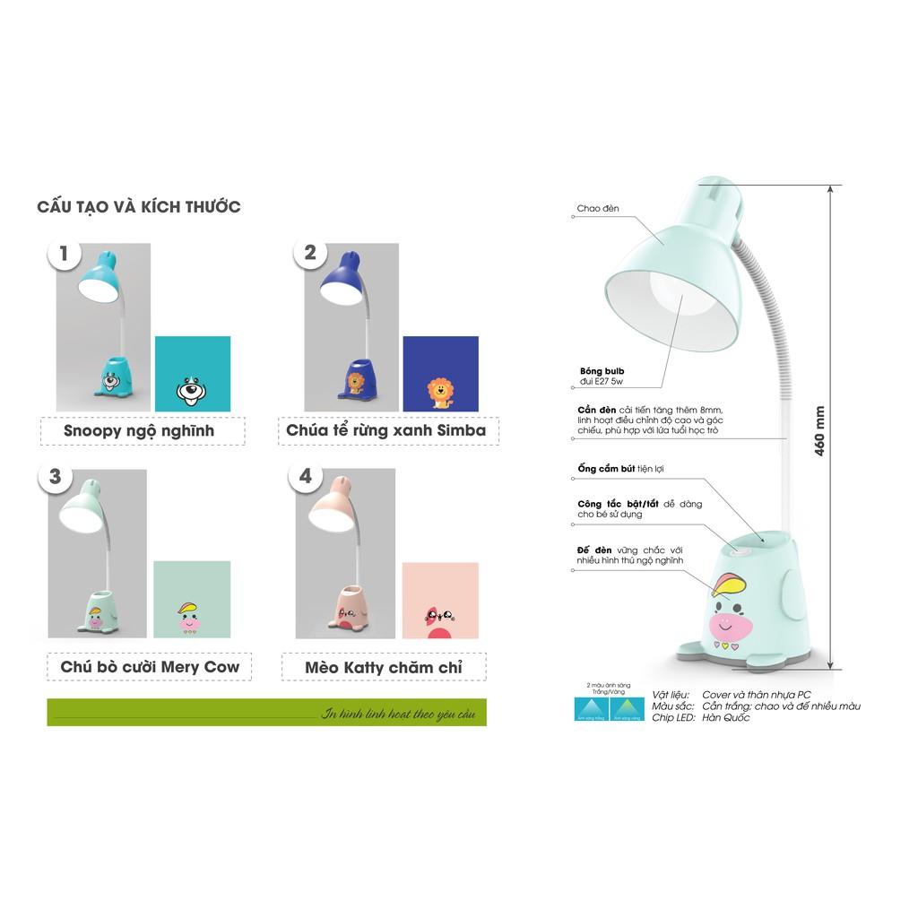 - Cần đèn linh hoạt điều chỉnh độ cao và góc chiếu sáng. Thiết kế hình xinh xắn và màu sắc siêu xinh cho bé