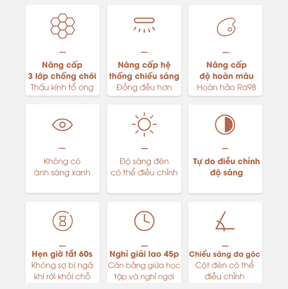 Đặc điểm nổi bật: - Chạm trượt điều chỉnh 5 cấp độ sáng - Chế độ hẹn giờ thông minh 45 phút - Chế độ đọc sách 4000K - Phần đế xoay tròn 180º -