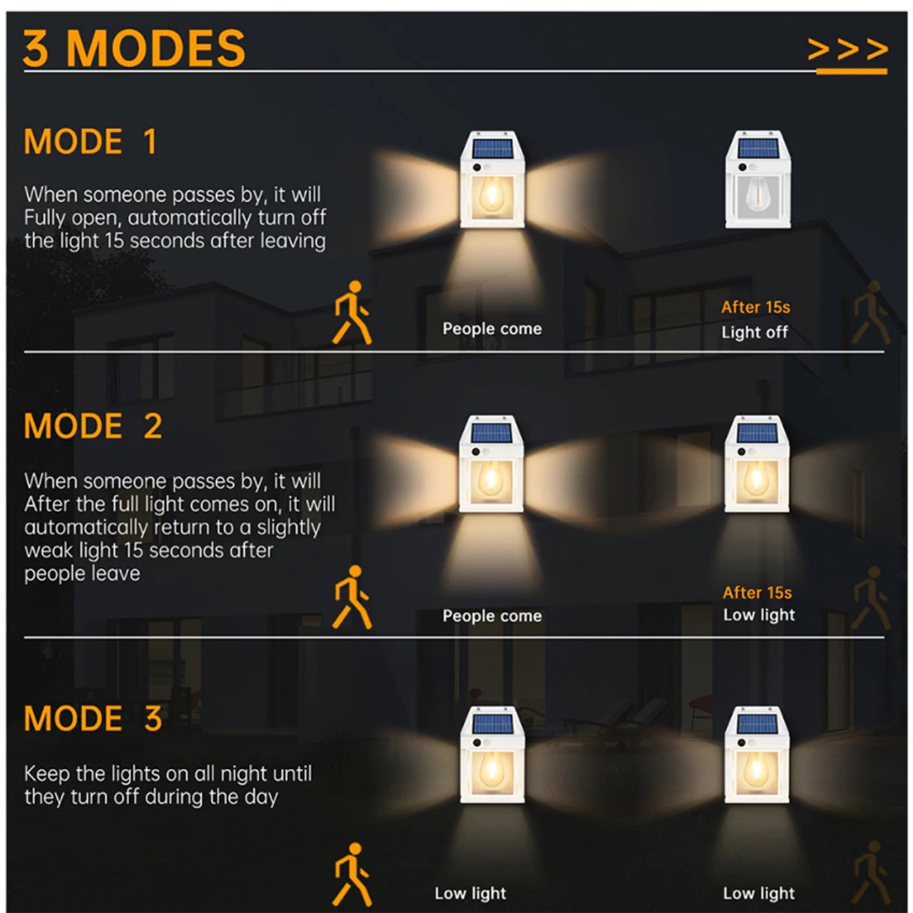 Đèn led năng lượng, đèn cảm ứng năng lượng mặt trời, dây vonfam chống thấm nước, bóng đèn cảm ứng hồng ngoại - HÀNG CHÍNH HÃNG MINIIN   Đèn led năng lượng mặt trời, cảm ứng năng lượng mặt trời, có màu trắng ấm, đèn tường ngoài trời cho nhà ở, dây vonfam chống thấm nước, bóng đèn cảm ứng hồng ngoại khi có người Các thông số của năng lượng mặt trời dây tóc vonfram đèn tường: Dẫn đặc điểm kỹ thuật: 2W đèn sợi đốt/chiếc Vật liệu đèn: PC + ABS Tấm năng lượng mặt trời đặc điểm kỹ thuật: Thủy tinh đơn silicon 5.5V 1.43W Pin Đặc điểm kỹ thuật: 18650 pin lithium 3.7V 1200mAh với và DIS bảo vệ. Công suất đầu ra: 3.2V/3W Thời gian sạc: 6 giờ dưới ánh mặt trời Góc cảm biến PIR: 120 độ Khoảng cách cảm ứng: 8-10m Kích thước sản phẩm: 17811cm Đóng gói Kích thước: 12.86.617.6cm. Nút chế độ ánh sáng: 1, bật: Bật công tắc, chế độ 1, sau đó công tắc bấm Chế độ 2, sau đó công tắc bấm Chế độ 3 và sau đó công tắc bấm để đóng. 2, 1 bánh: Ai Đó sáng lên trong 15-30 giây, và sau đó không ai tắt đèn; Bánh răng thứ 3 và thứ 2: ánh sáng có người lái chiếu sáng ánh sáng mạnh trong 15 đến 30 giây, và sau đó ánh sáng không người lái luôn chiếu sáng ánh sáng yếu; Bánh răng thứ 4 và Thứ 3: có người lái, ánh sáng thấp luôn bật.