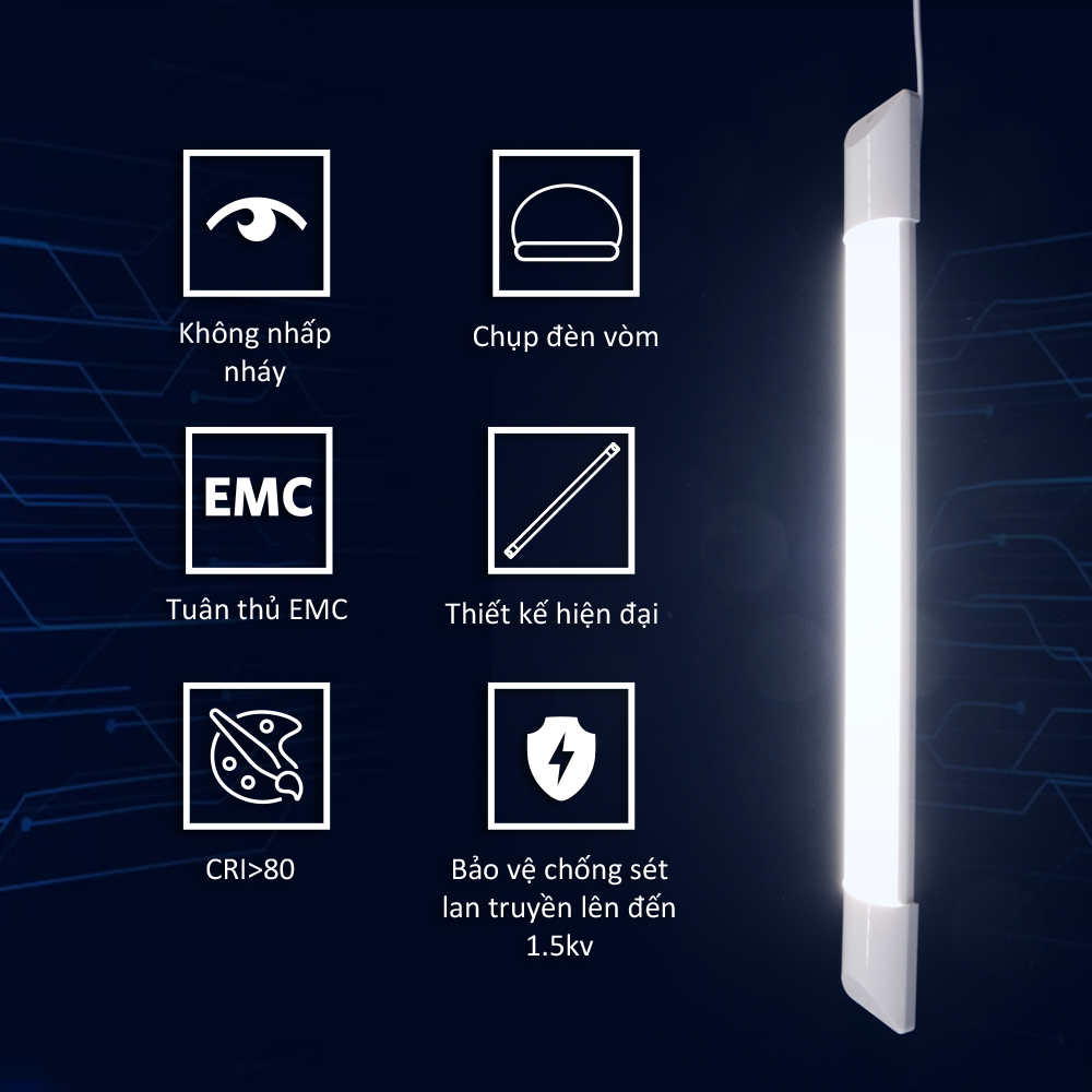 · Công suất: 14 W ( 1000 giờ sử dụng liên tục hết 14 số điện) · Điện áp: 220V/50 Hz · Dòng điện (MAX): 160 mA · Hệ số công suất: 0.5 · Góc