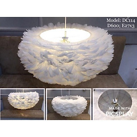DT LUXURY Chất liệu: đèn được gia công từ lông gà nhân tạo Mầu sắc: trắng Số lượng :01c Nguồn điện: 220v Kích thước: fi 600mm Phong cách: châu âu Nguồn sáng:đui e 27 x