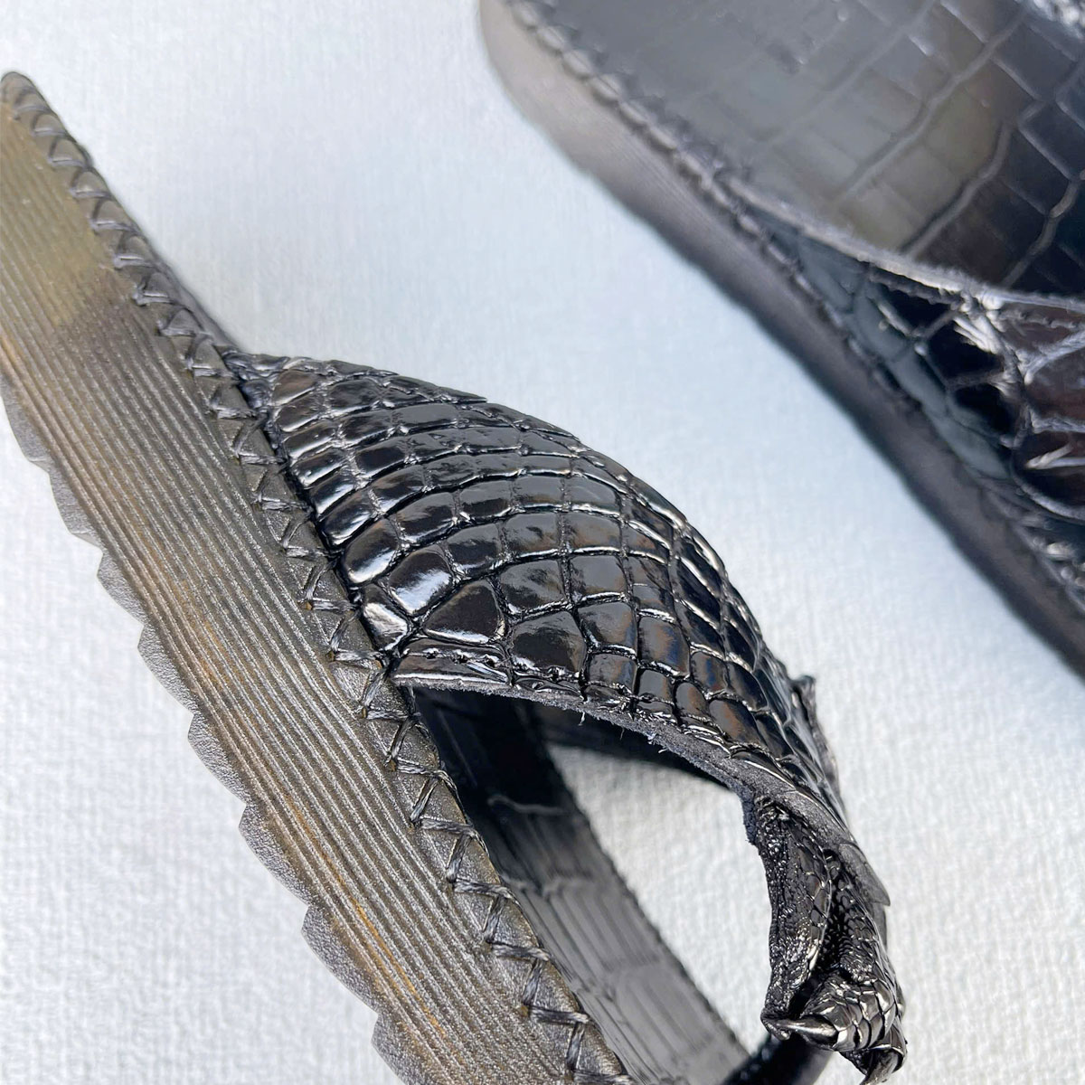 Quai dép làm bằng da cá sấu, với họa tiết móng cá sấu đặc trưng được lựa chọn từ da cá sấu trưởng thành nên da mềm, mịn và bóng đẹp tự nhiên, bền và đẹp nhất của cá sấu.